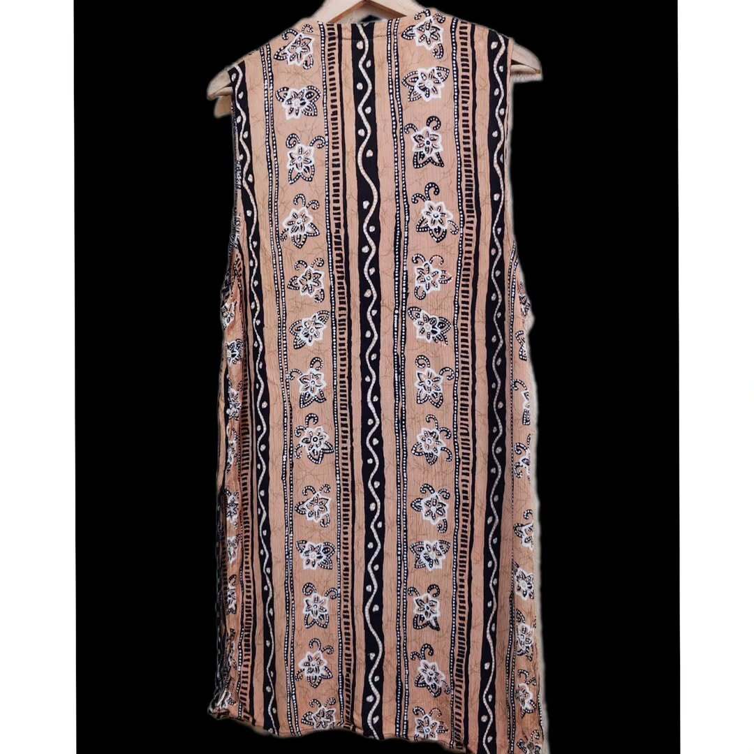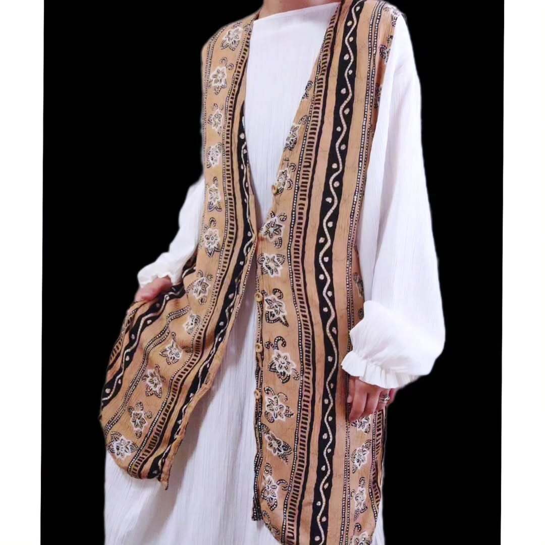 雰囲気のあるエスニックテイストな柄がとてもおしゃれな、ヴィンテージのロングベストです。