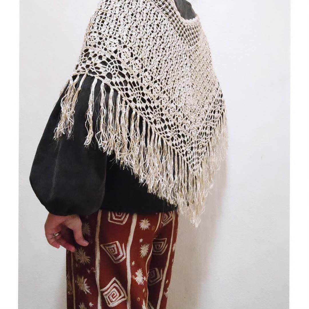 usedのコーデュロイトップスと、ヴィンテージのレース編みフリンジトップスをリメイクした、個性的で素敵な一着です。