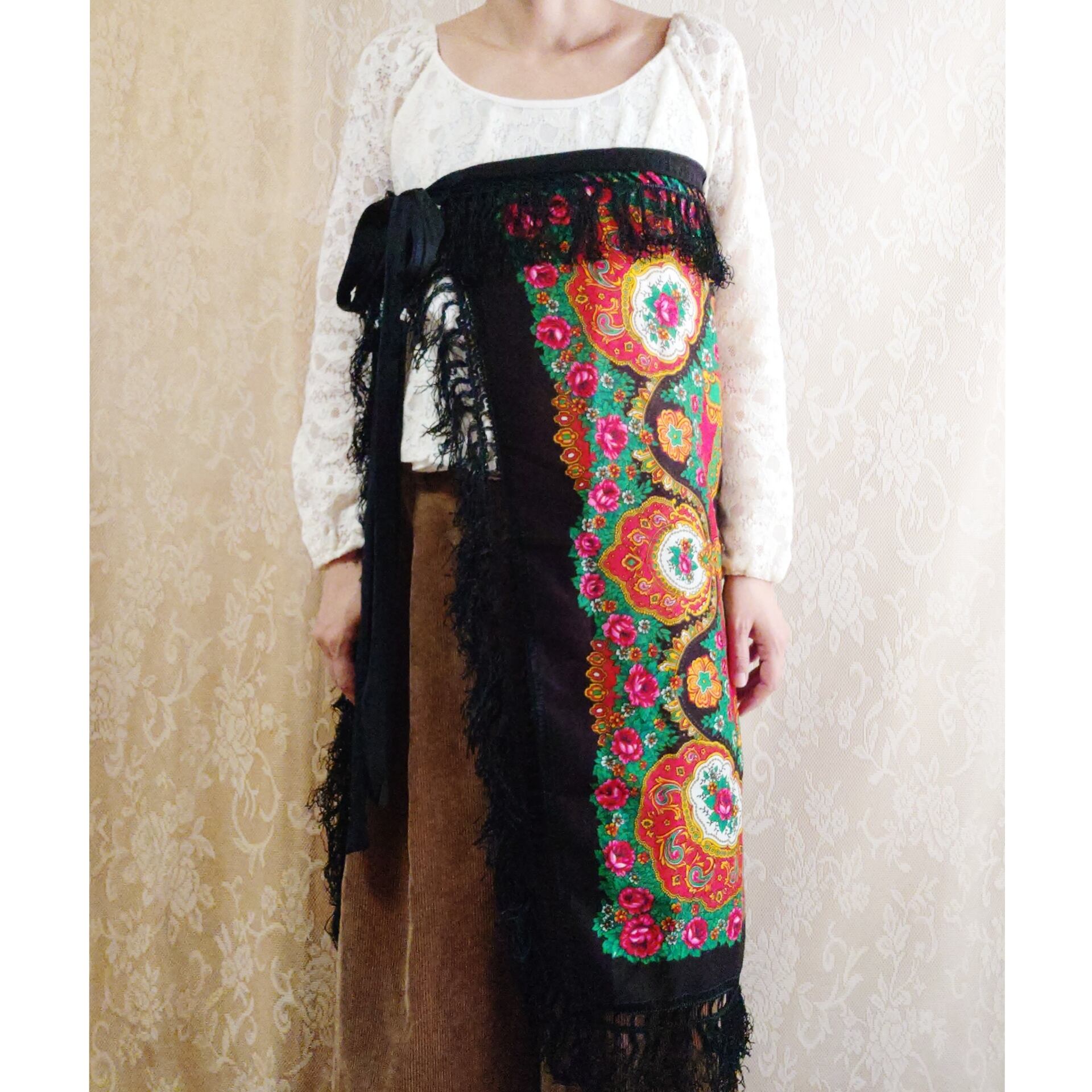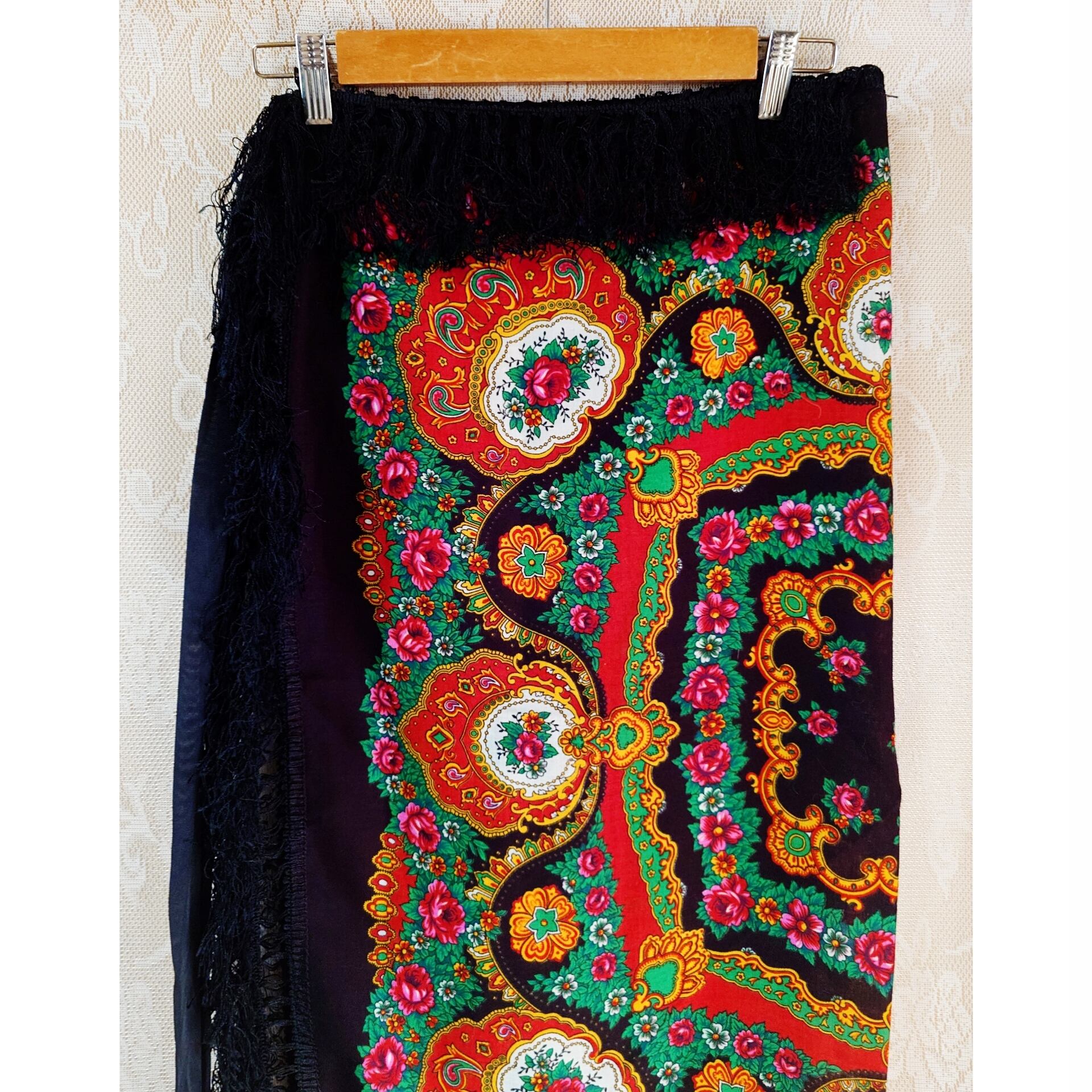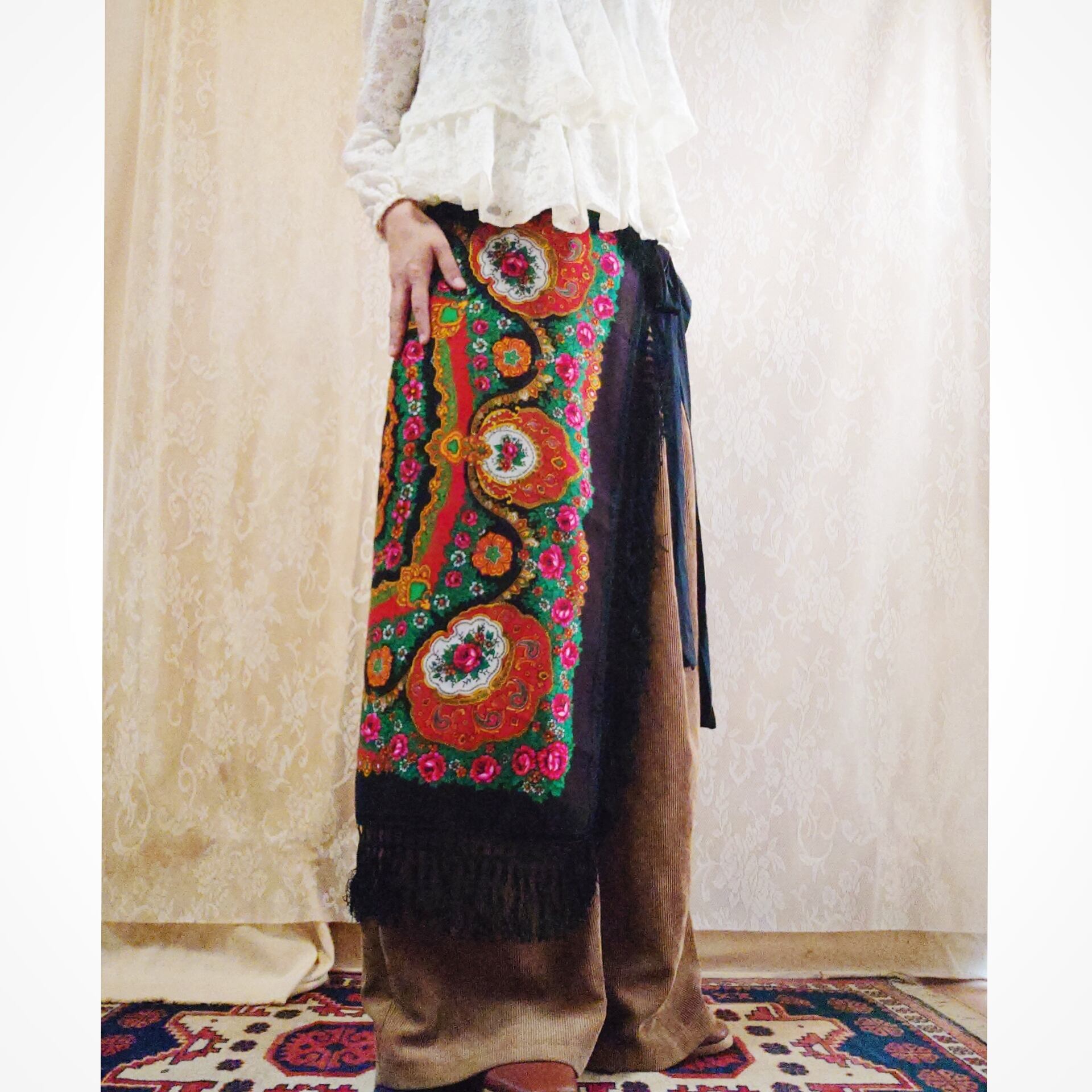 ヴィンテージのショールをリメイクして、ラップスカートにデザインした、たまらなく素敵な一着です。