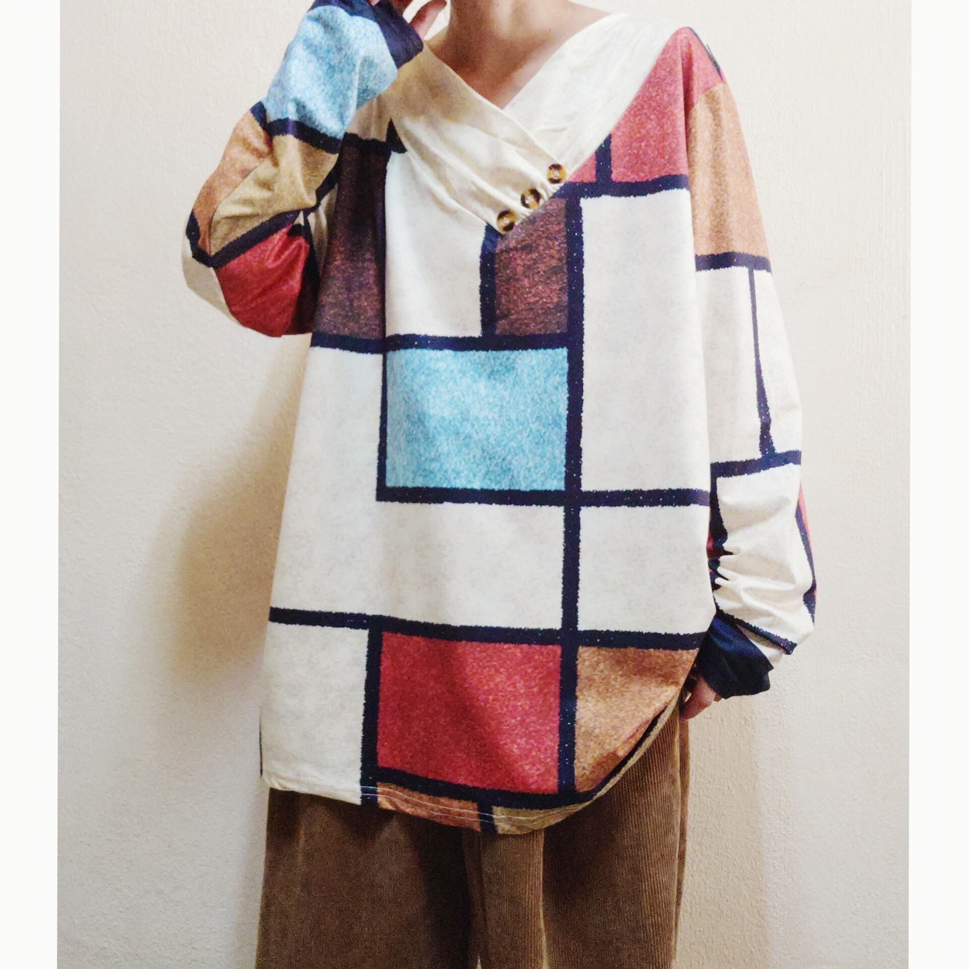 モダンチックな柄とショールカラーデザインが、個性的でとても素敵な、ヴィンテージのトップスです。