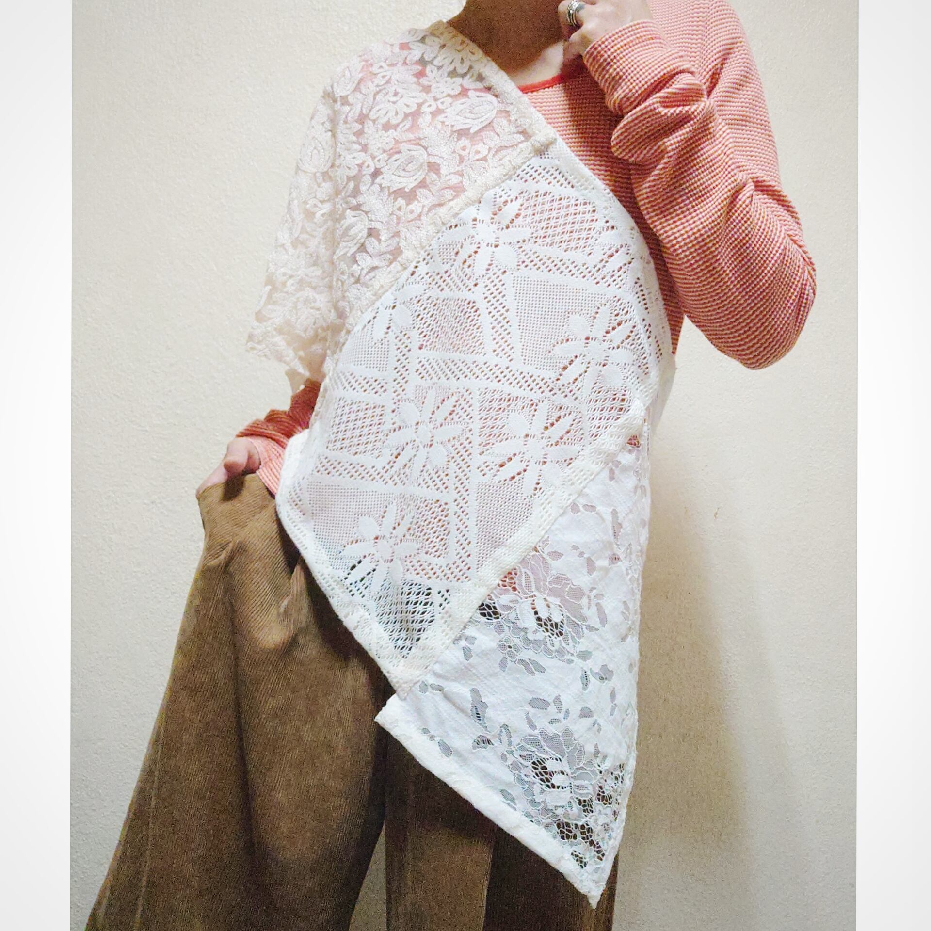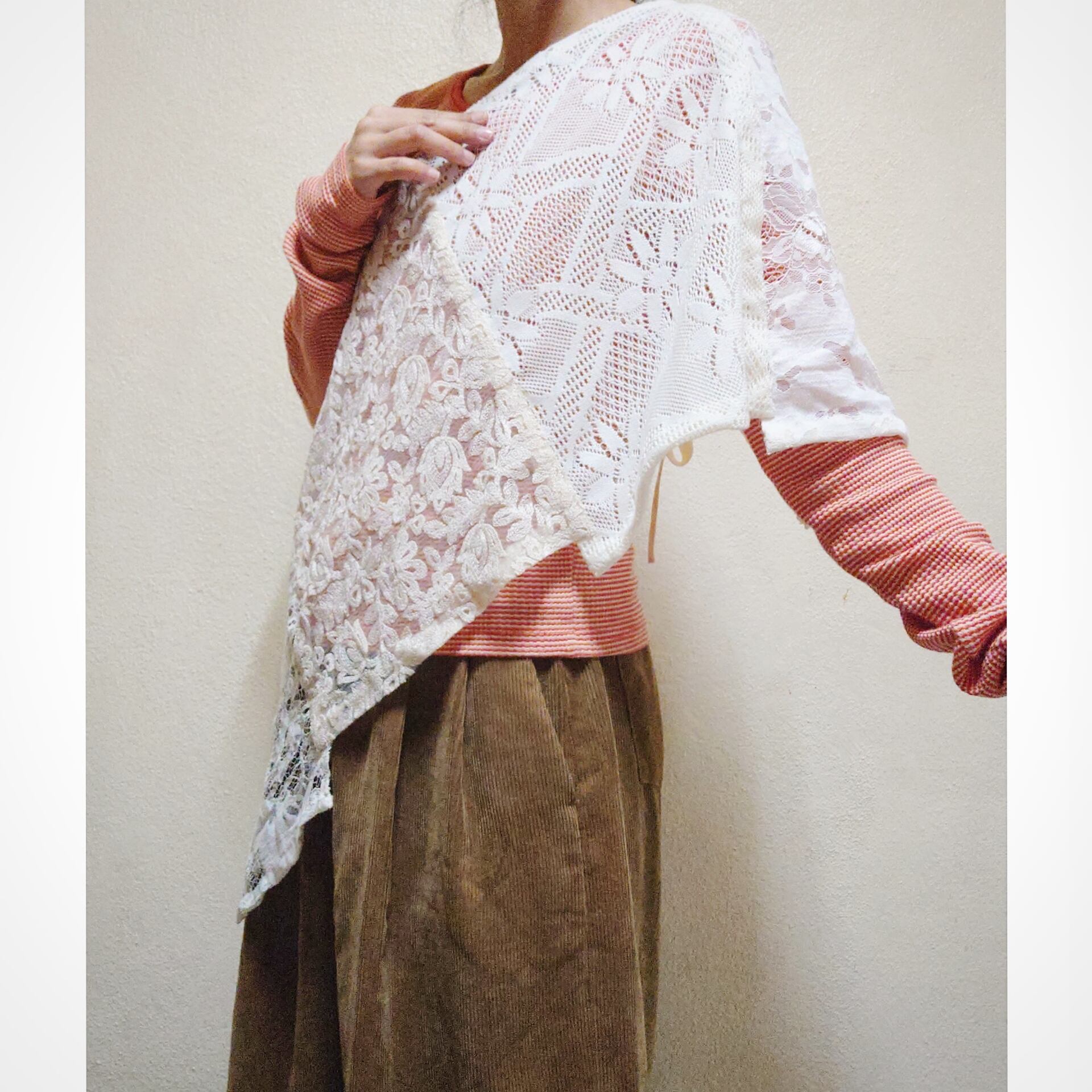 ヴィンテージのレースクロスや、ヴィンテージお洋服の端切れを使い、ラップスカートにリメイクしたたまらなく素敵な一着です。