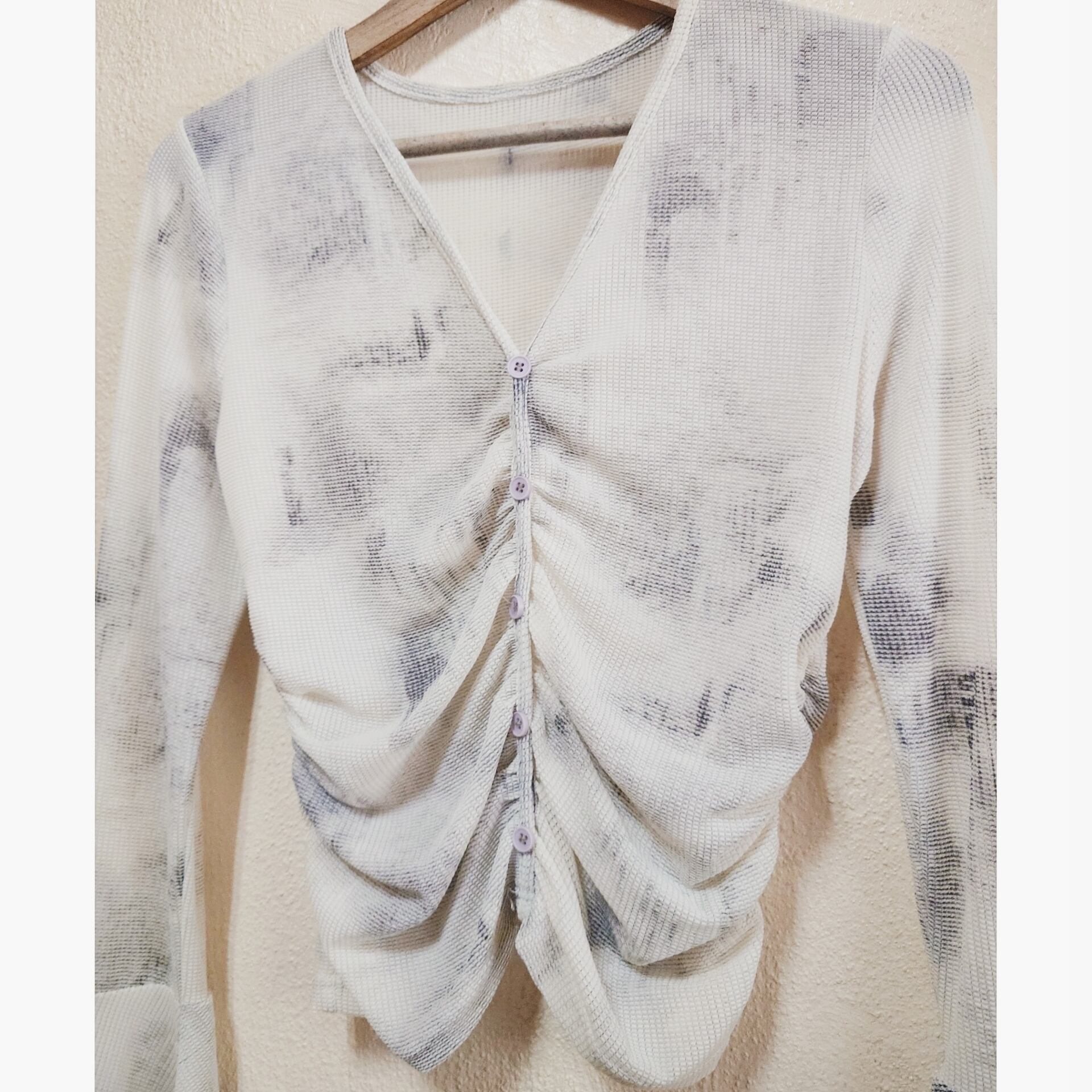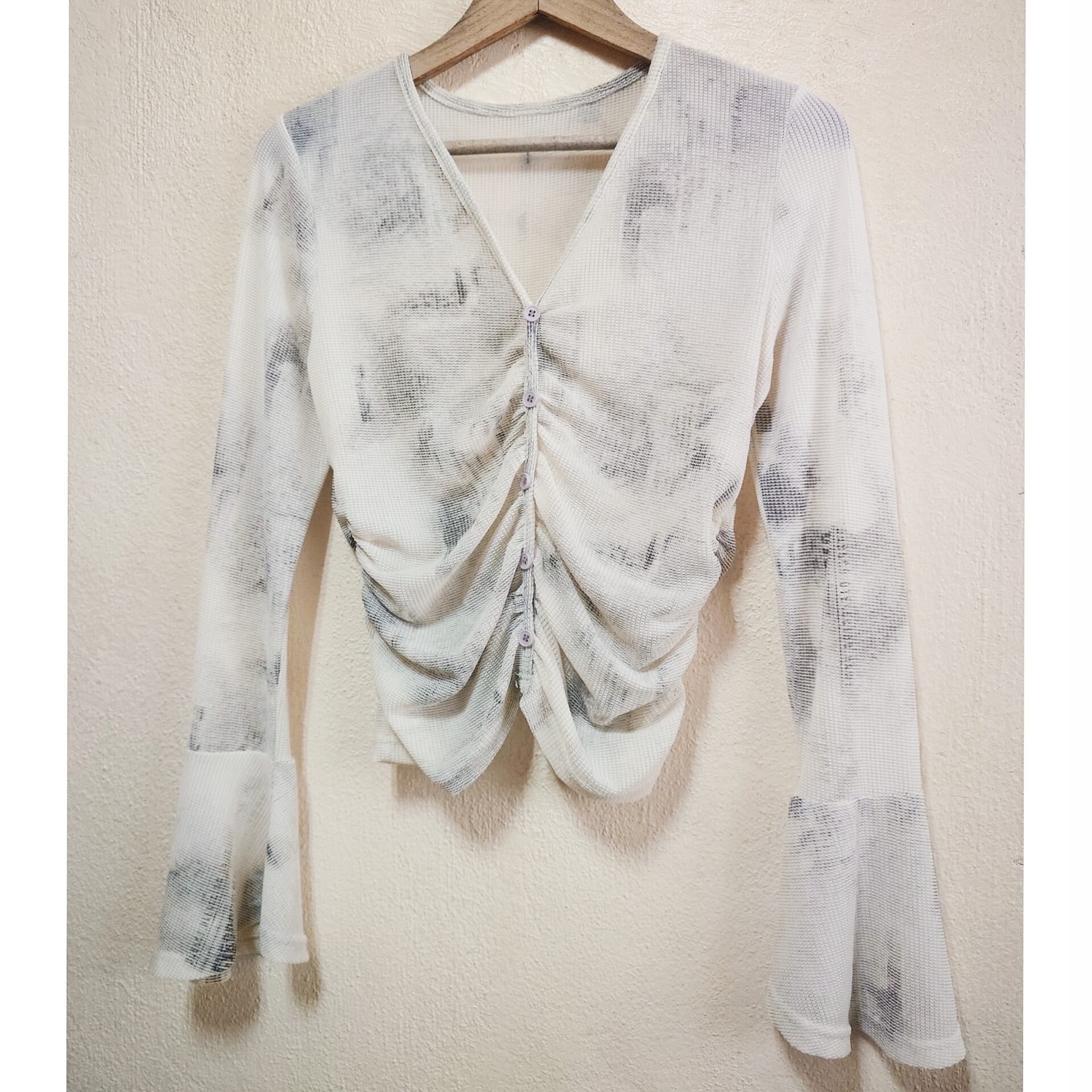 タイダイ染めのような風合いのテキスタイルも素敵で、存在感のあるベルスリーブが更におしゃれ感を際立たせています。