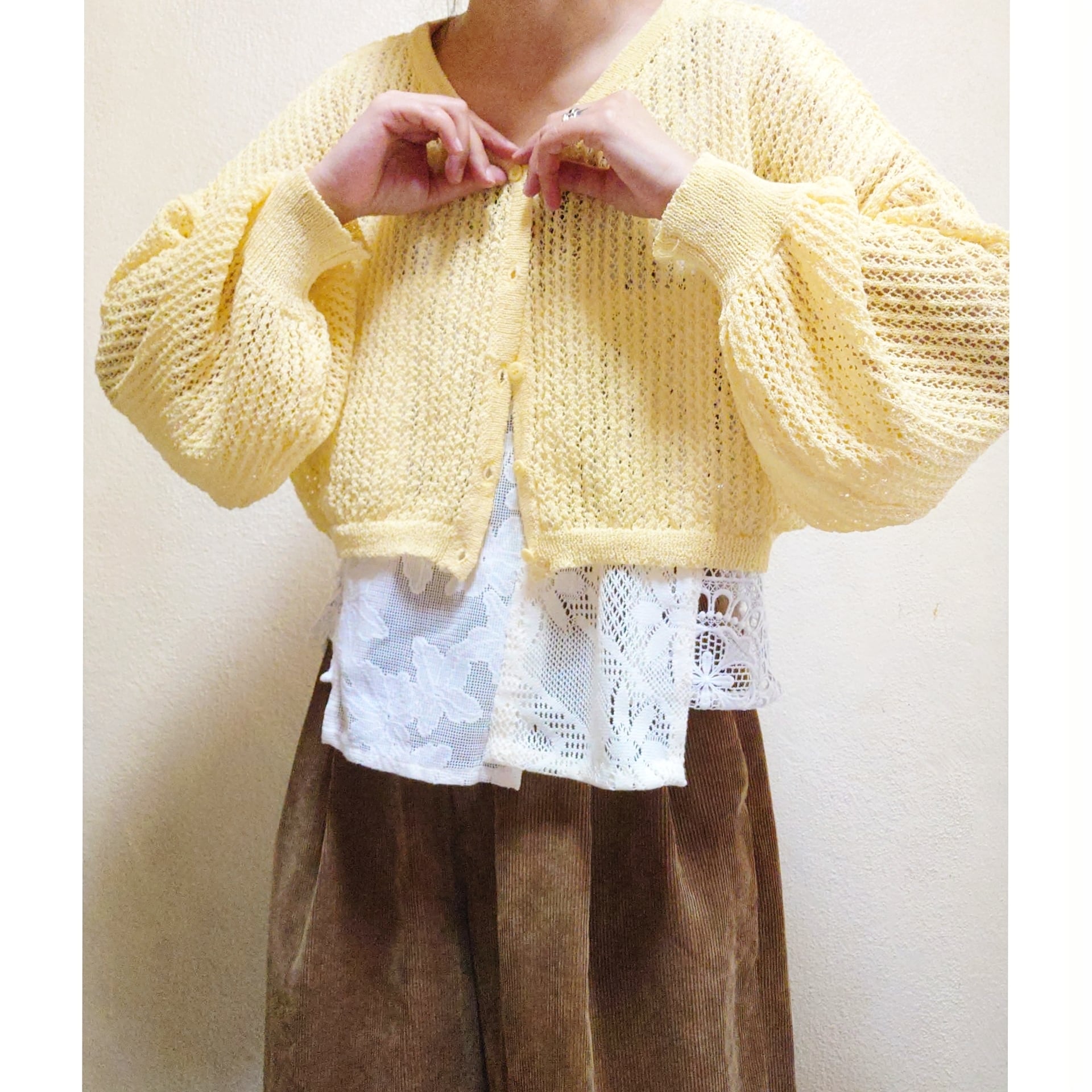 存在感のあるボリュームスリーブがたまらなく可愛い、ヴィンテージのスプリングニットカーディガンです。