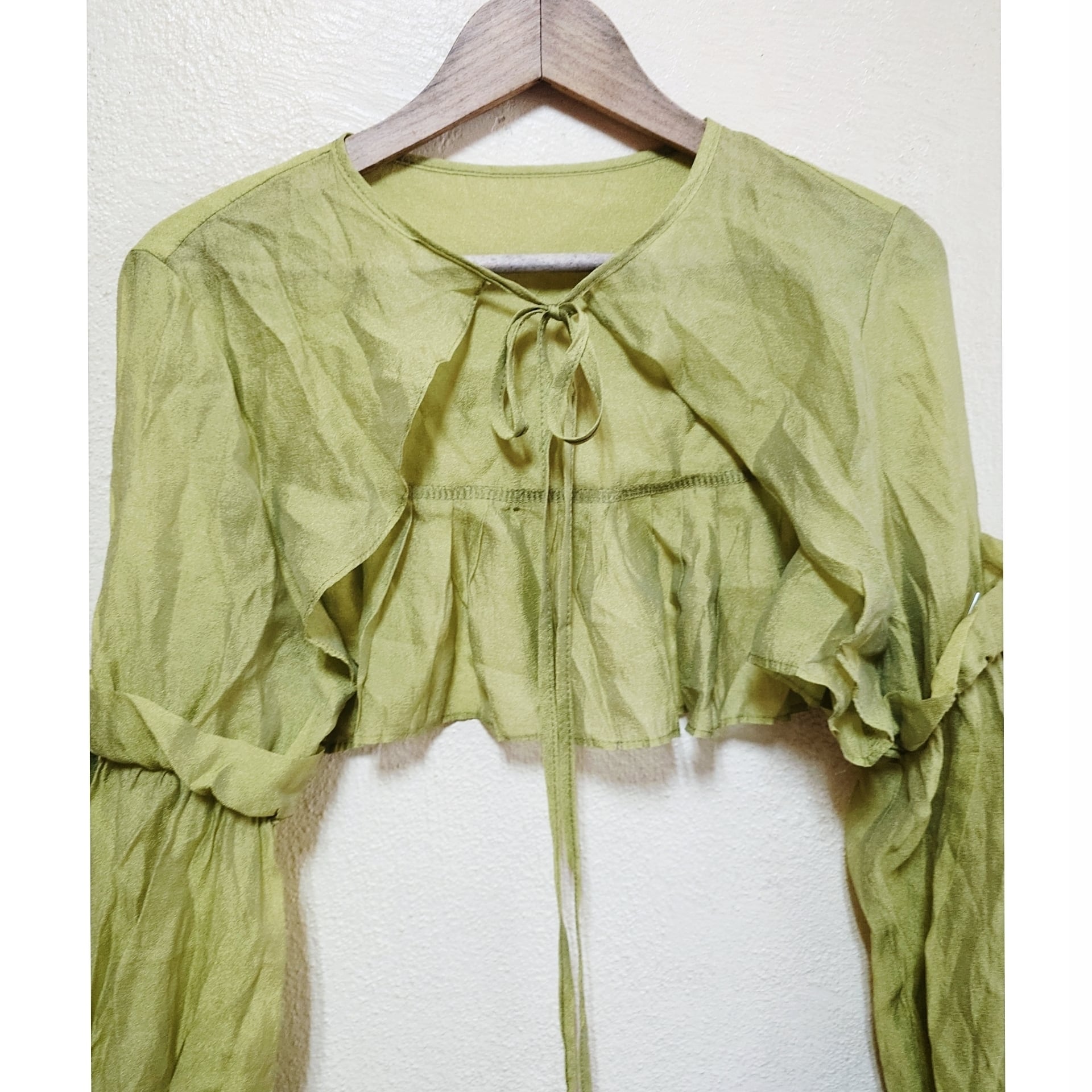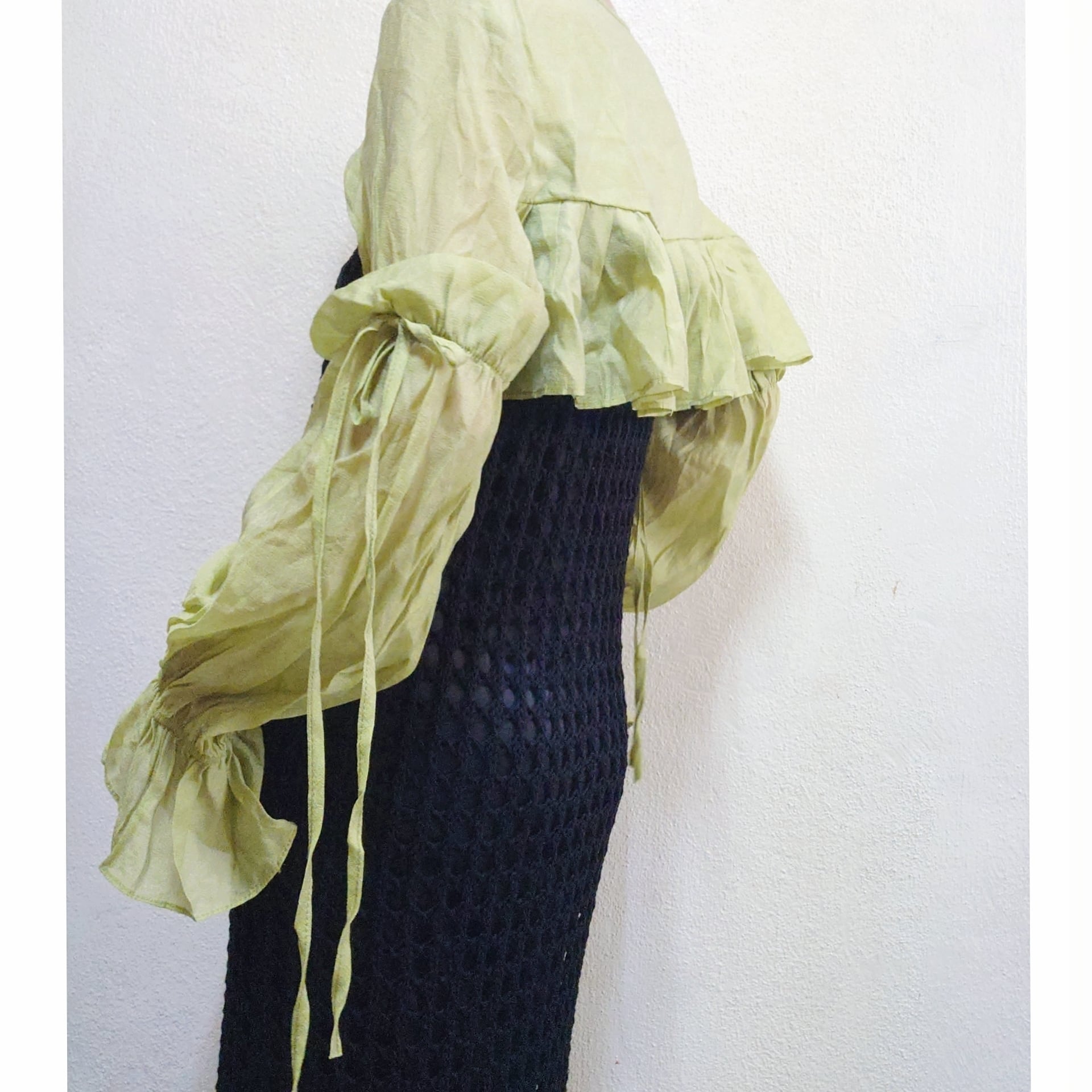 袖はストレートにおろしても素敵ですし、袖ぐりがゴムなので、上にまくってボリュームを出しても可愛いです。
