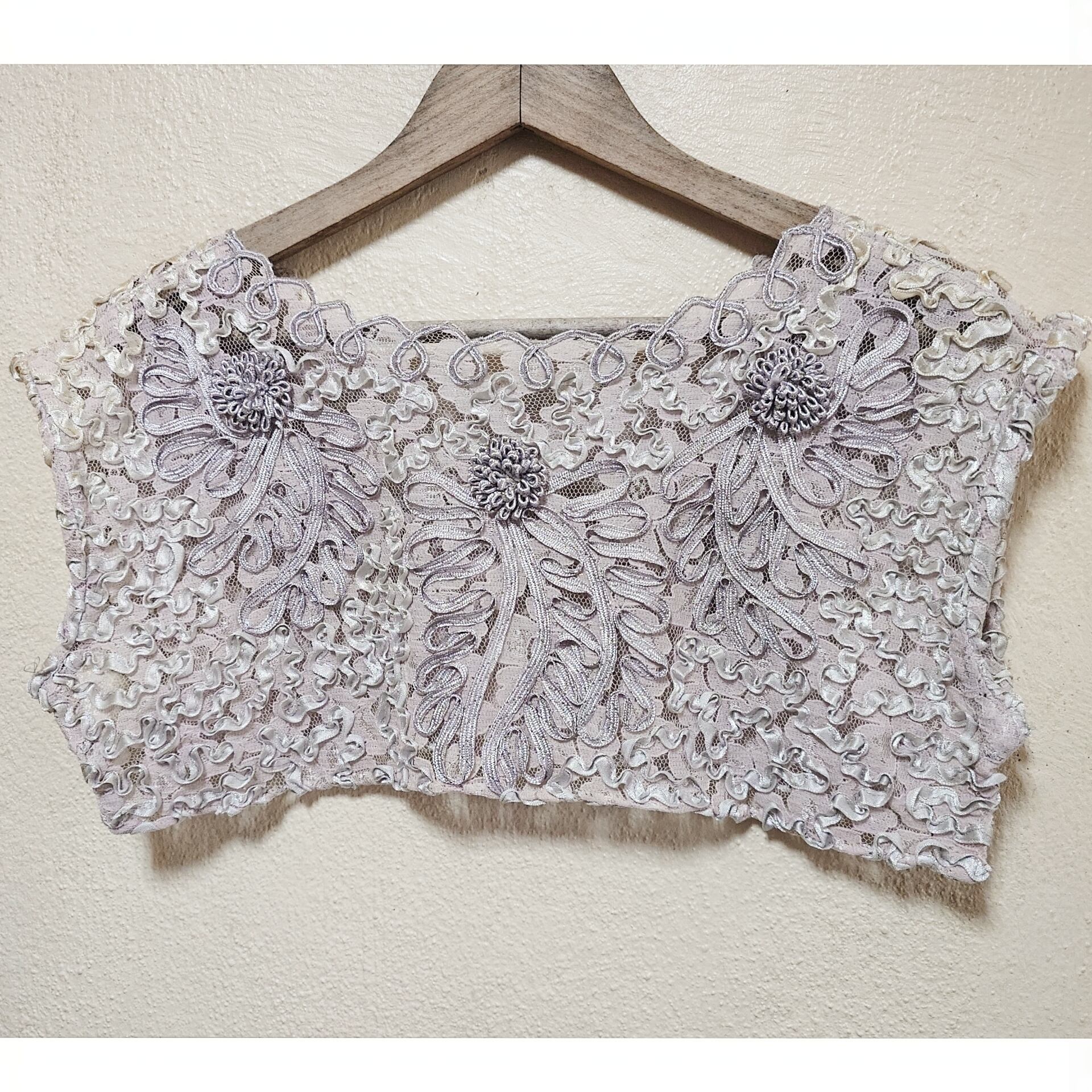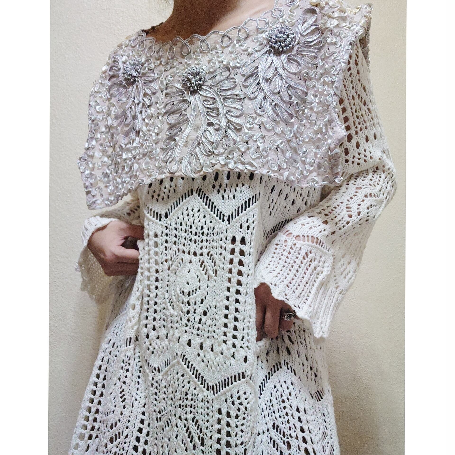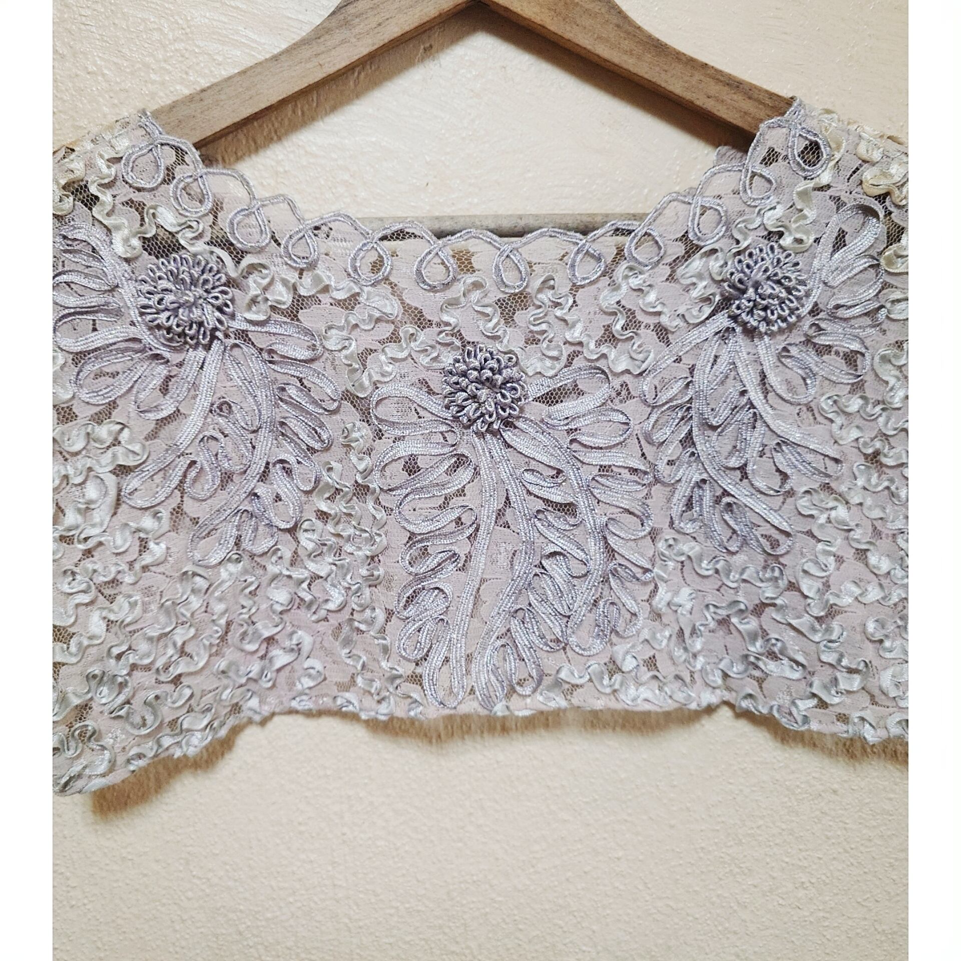 レース地に、立体感のあるコード刺繍やお花がついたデザインで、唯一無二な付け襟。
