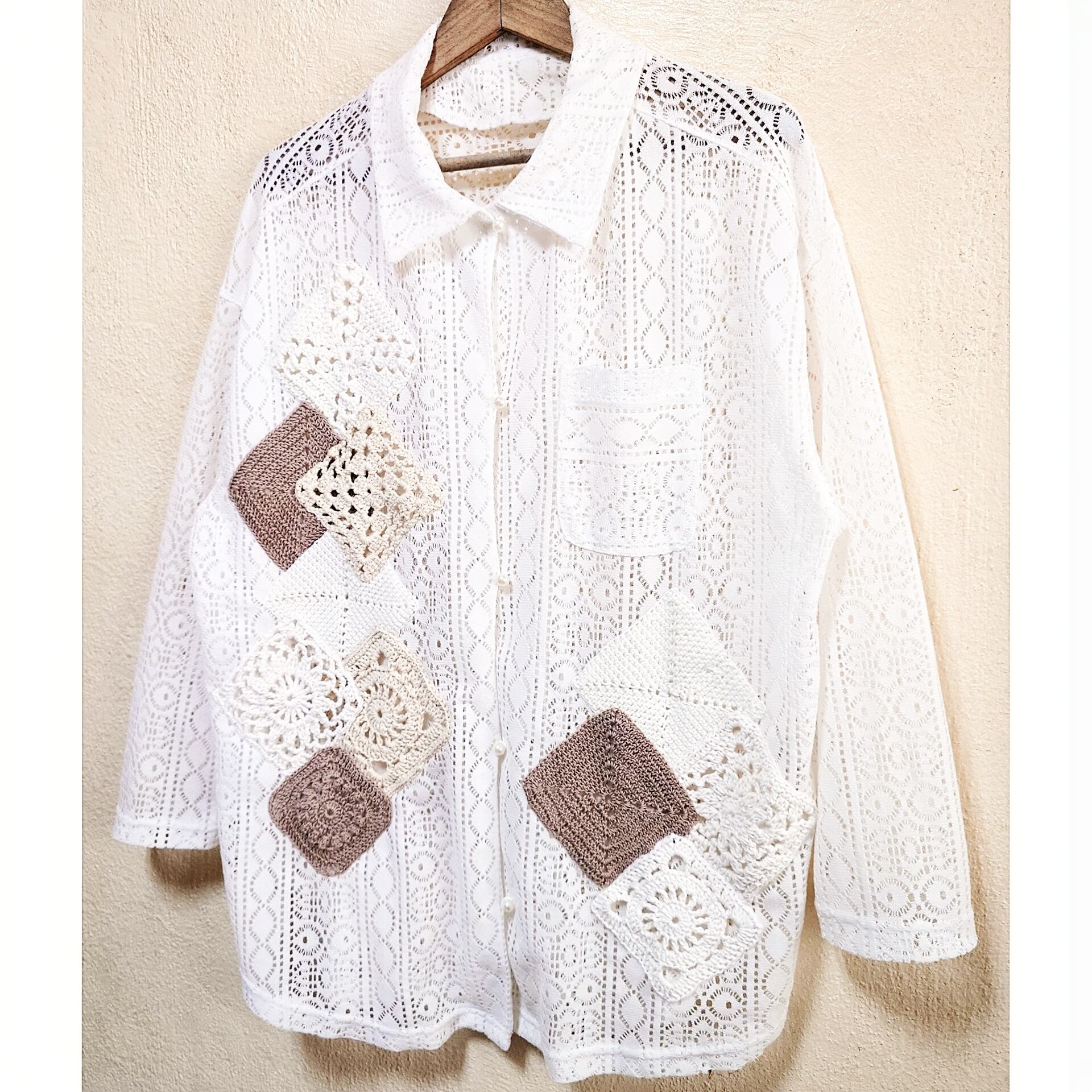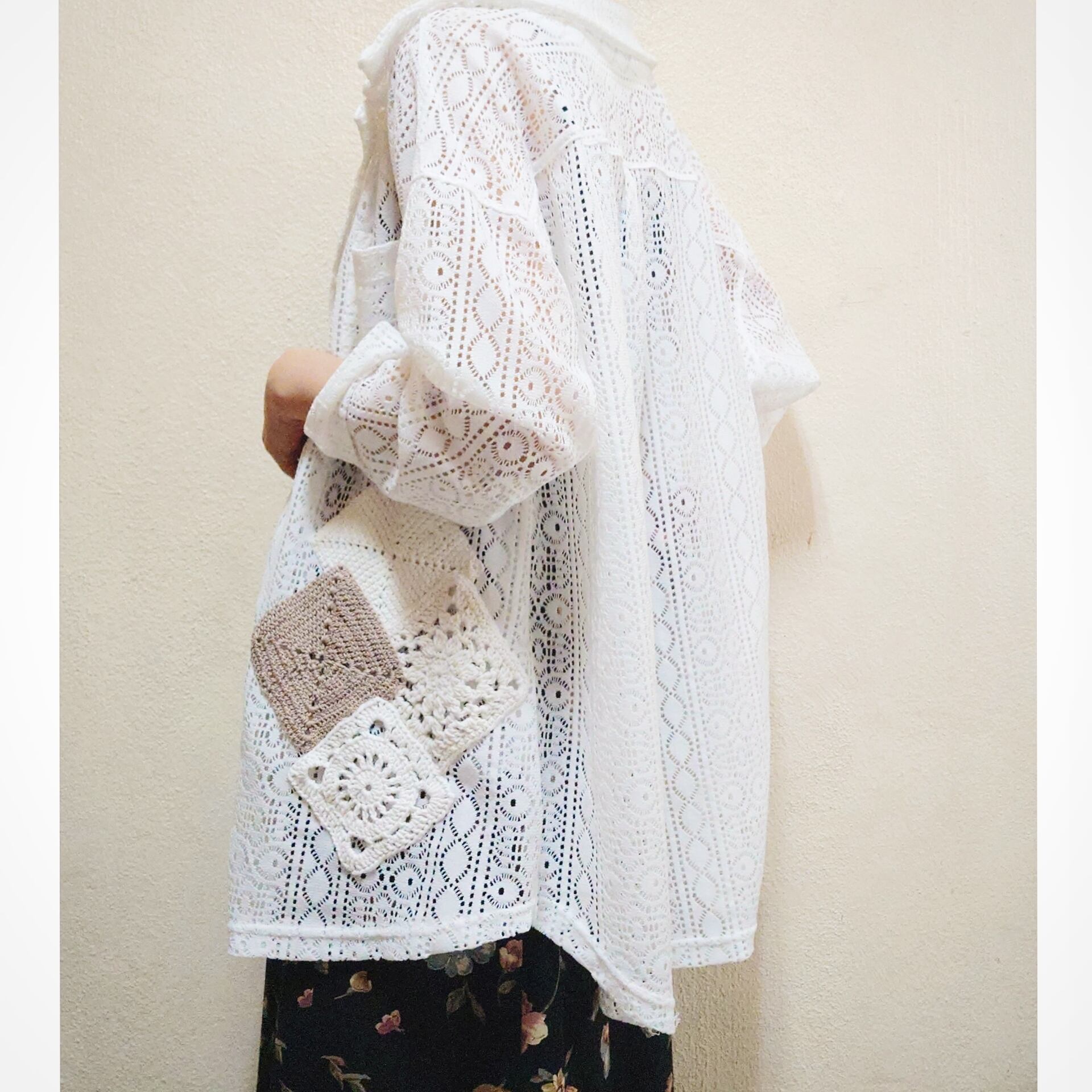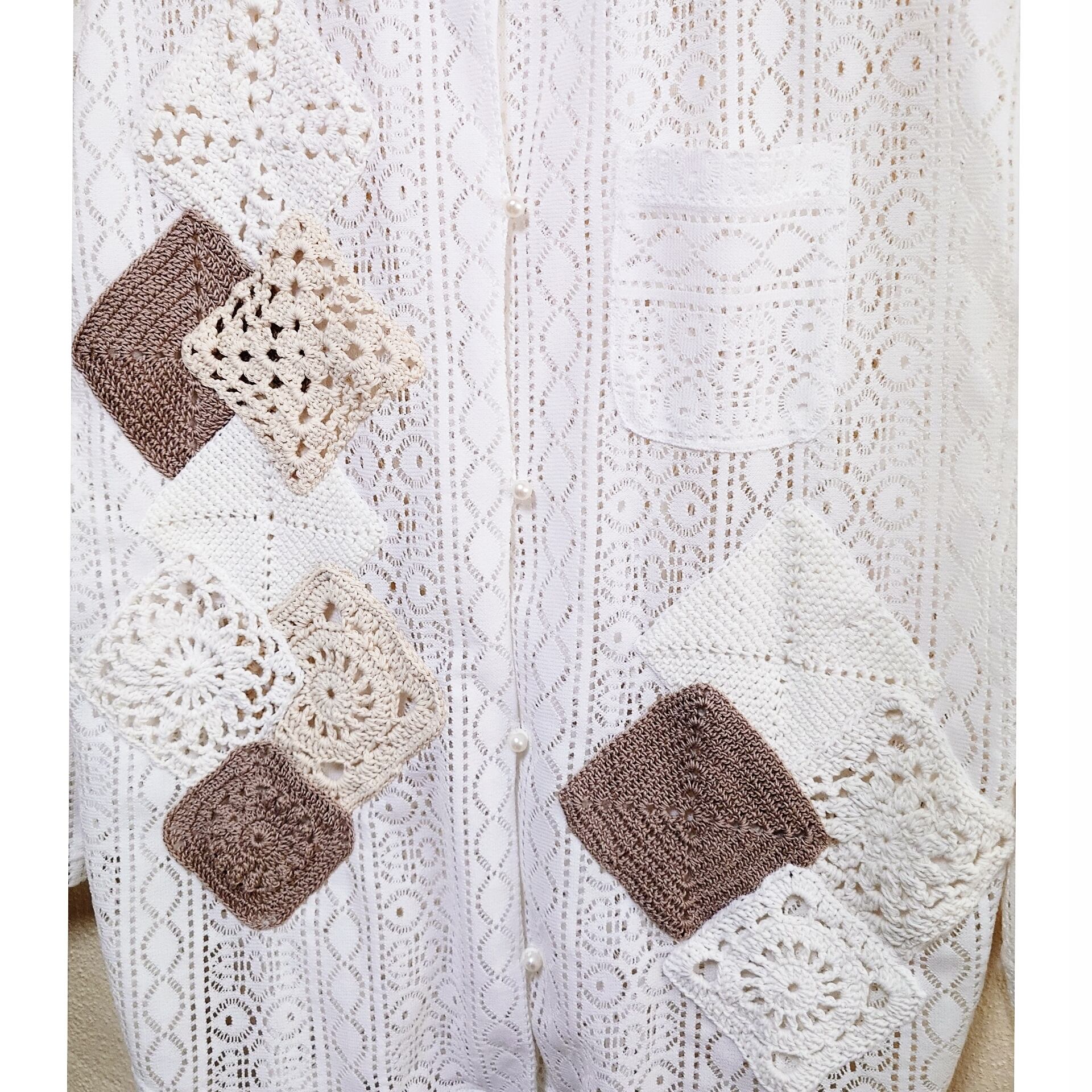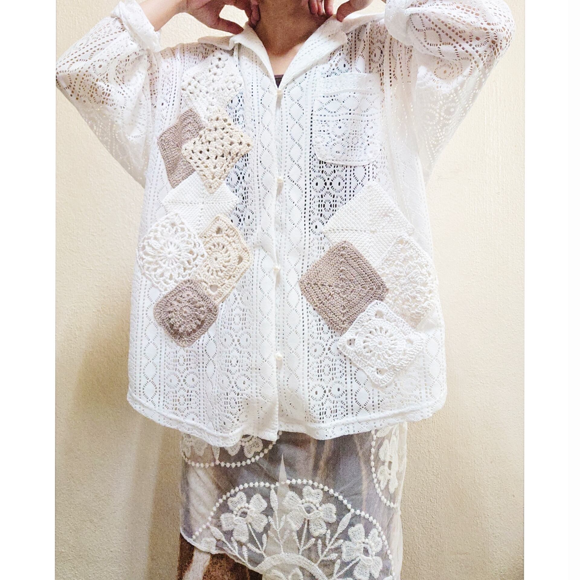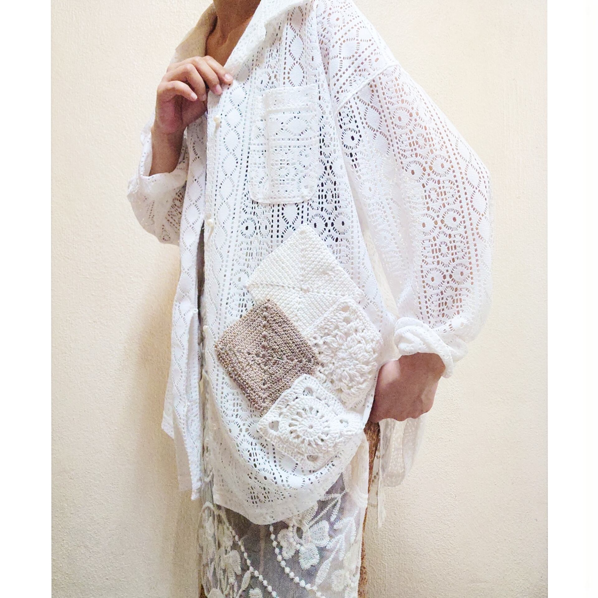 古着のレースshirtをベースに、ハンドメイドのレース編みドイリーをつけリメイクした、たまらなく素敵な一着です。