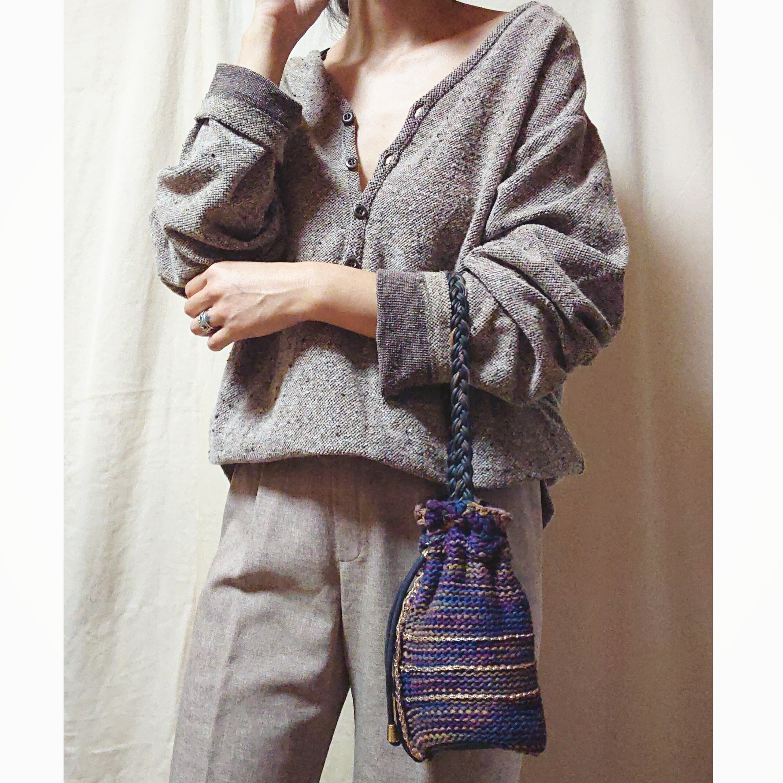 パープル・ネイビー・ブラウン系カラーのミックスニットで編まれています。