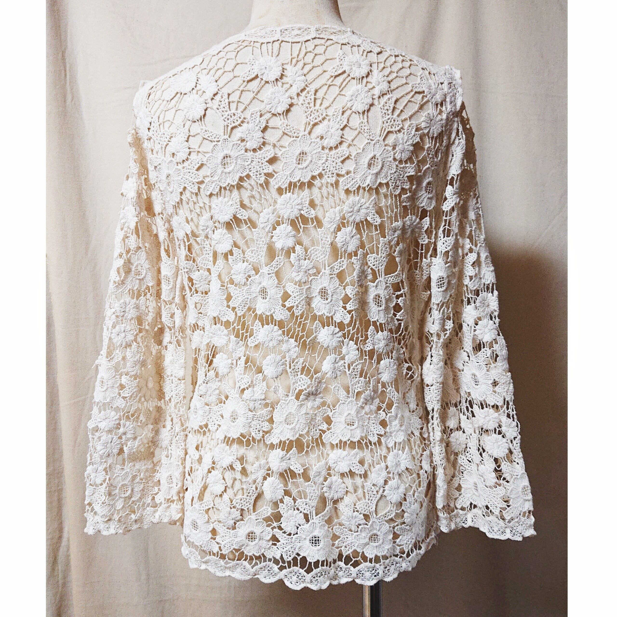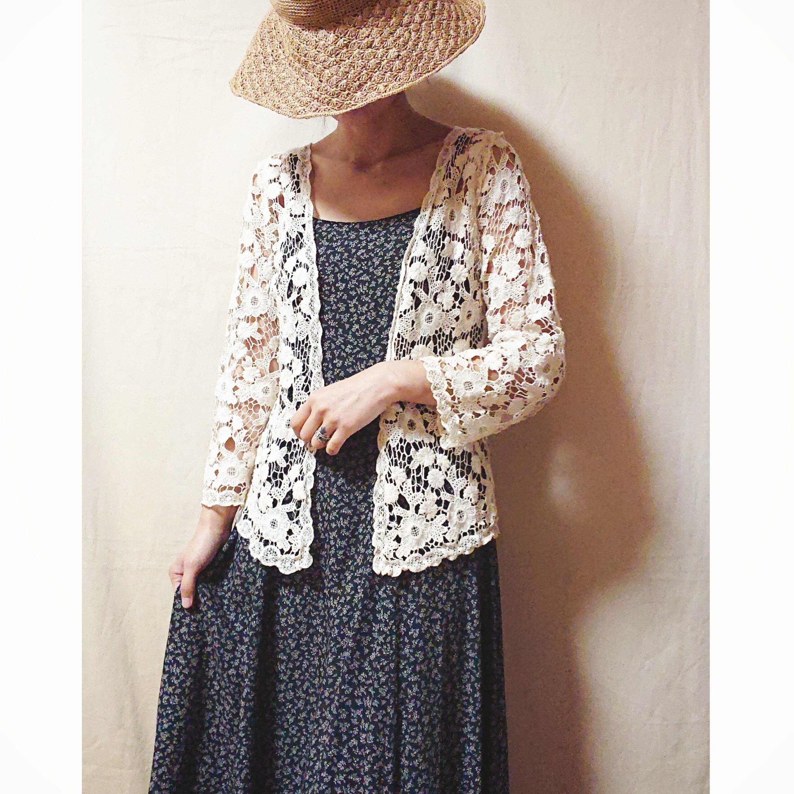お花モチーフのクロシェレースが、うっとりするぐらい素敵な、vintageのカーディガンです。