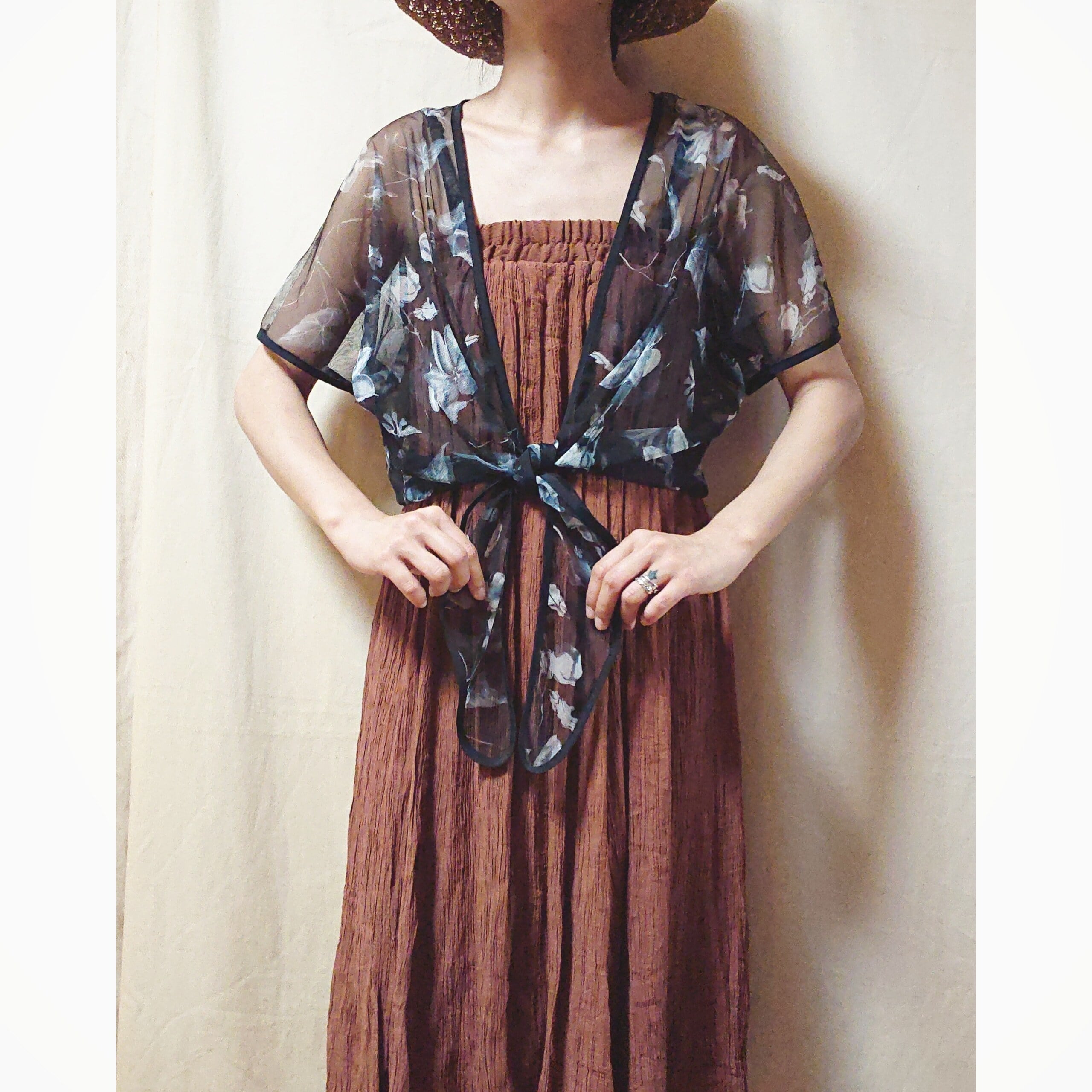 透け感のあるシアー素材で、淡いトーンの花柄がたまらなく可愛いです。