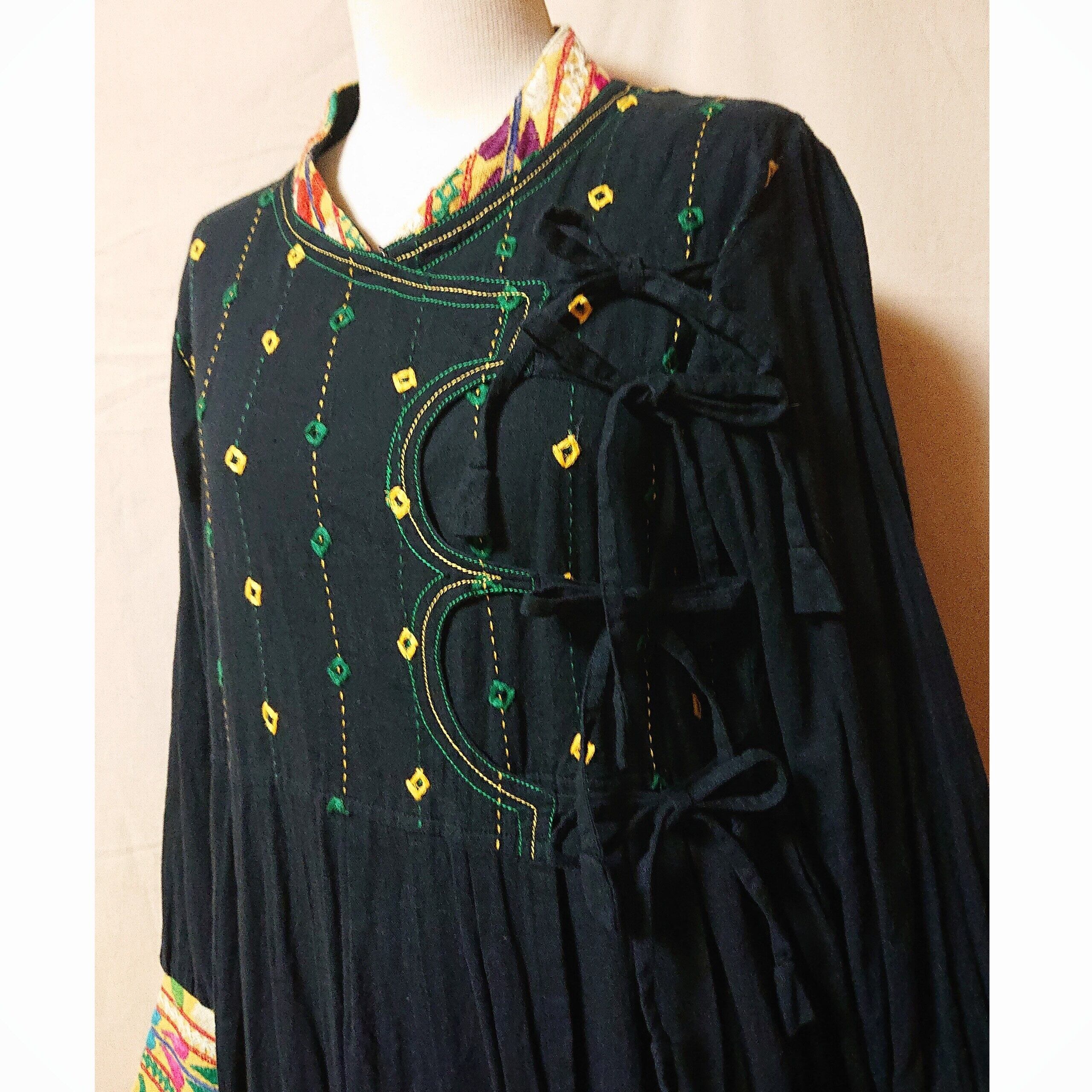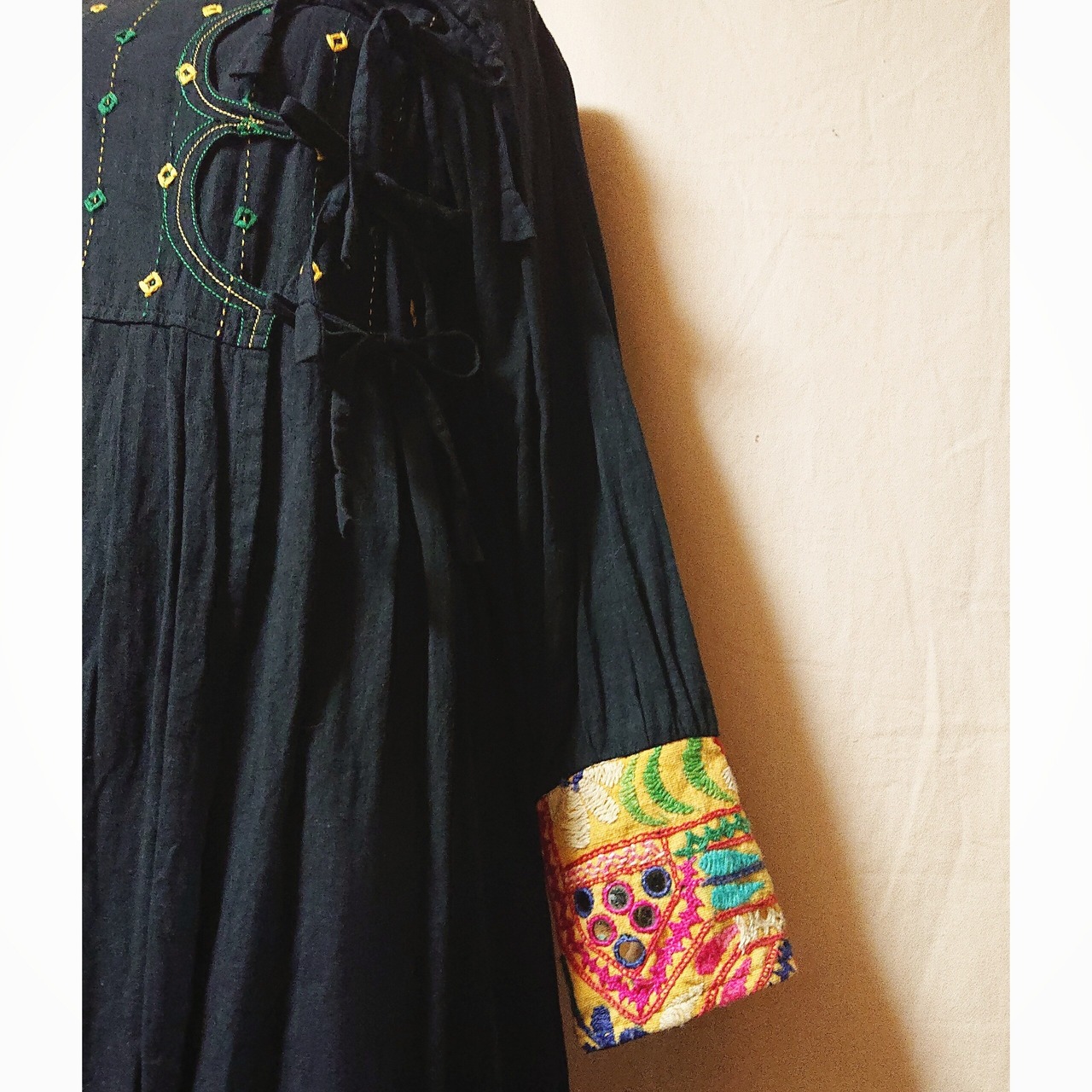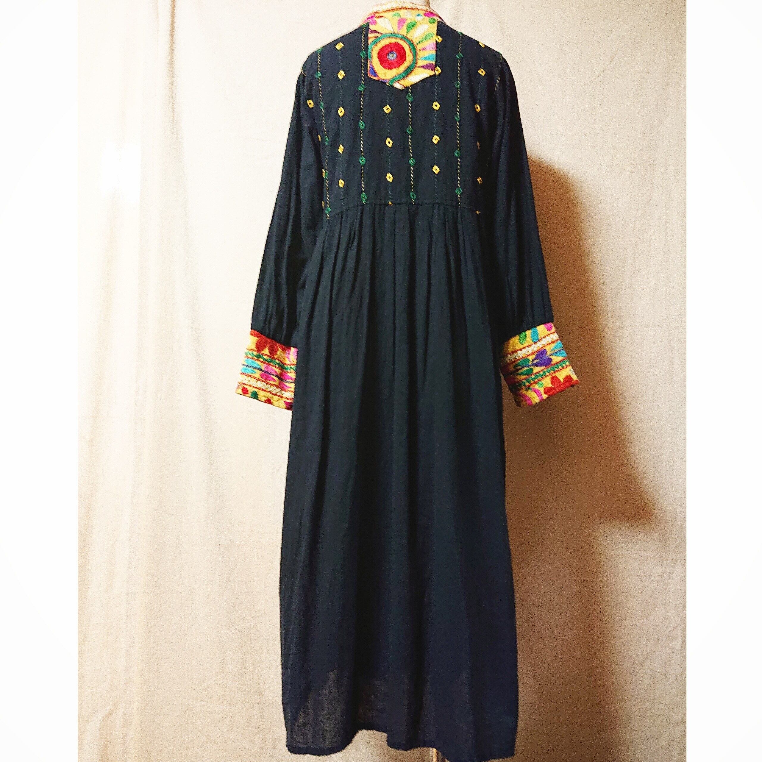 黒地に映える雰囲気たっぷりの、グジャラート刺繍がたまらなく素敵な、vintageのワンピースです。