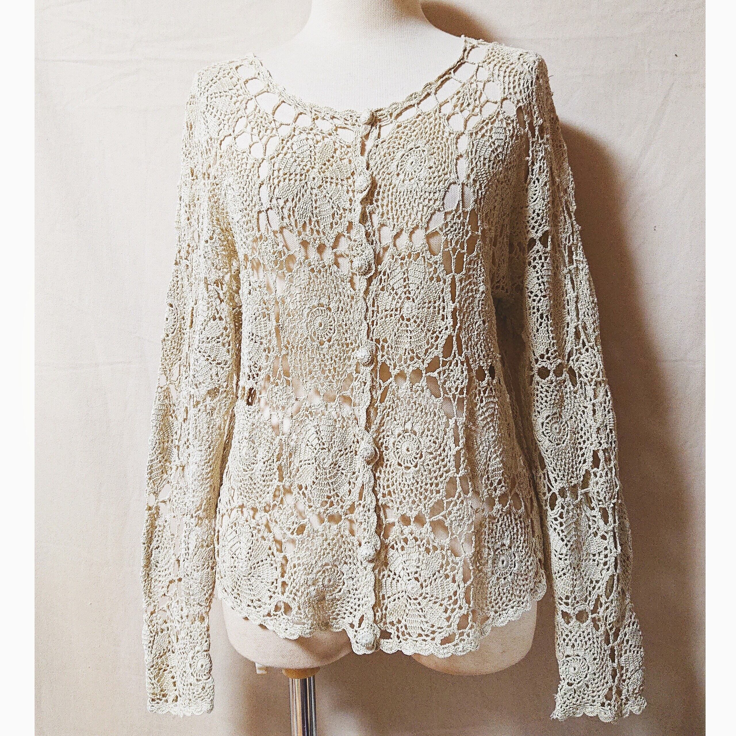 コットンニットで編まれたクロシェ編みが、たまらなく可愛いヴィンテージのカーディガンです。