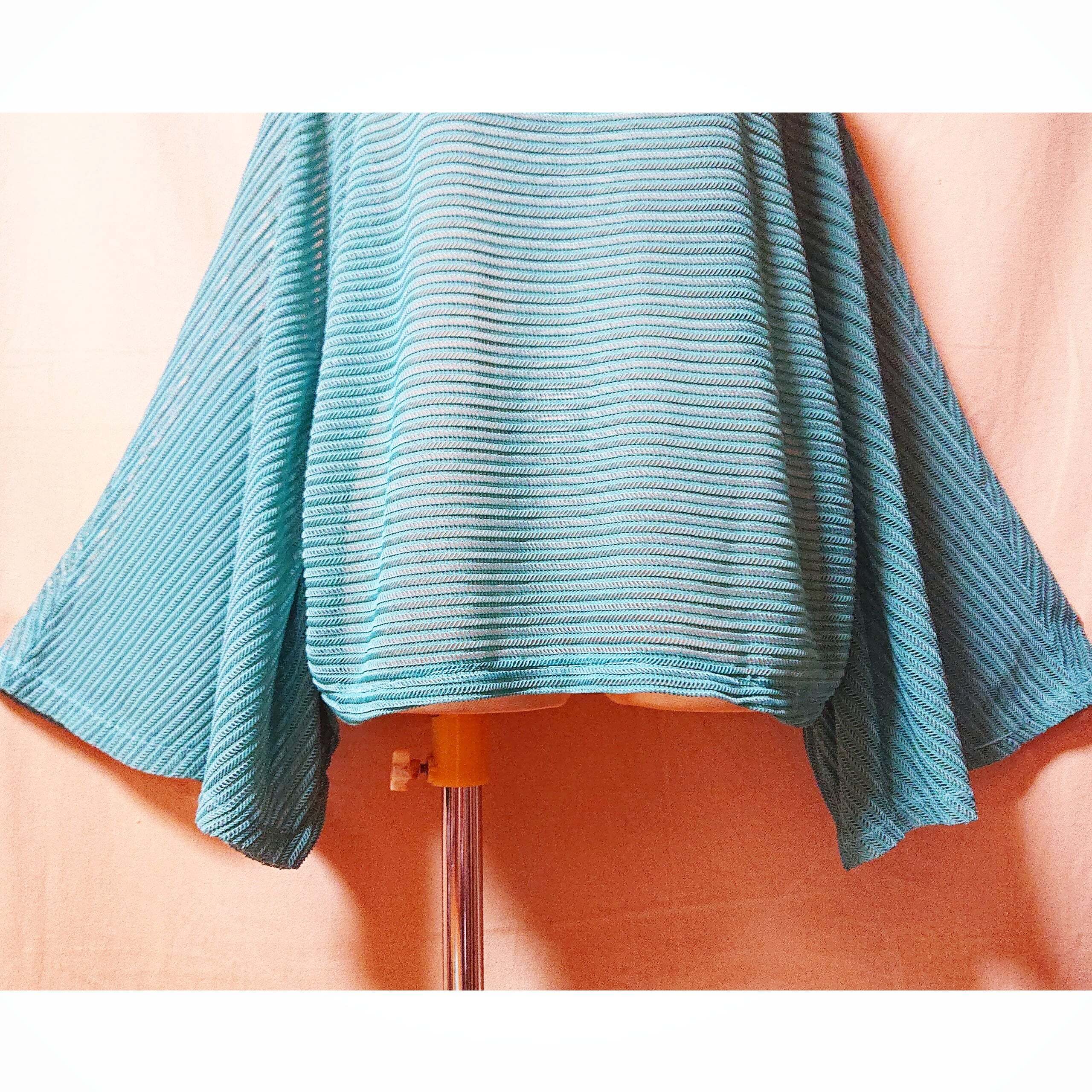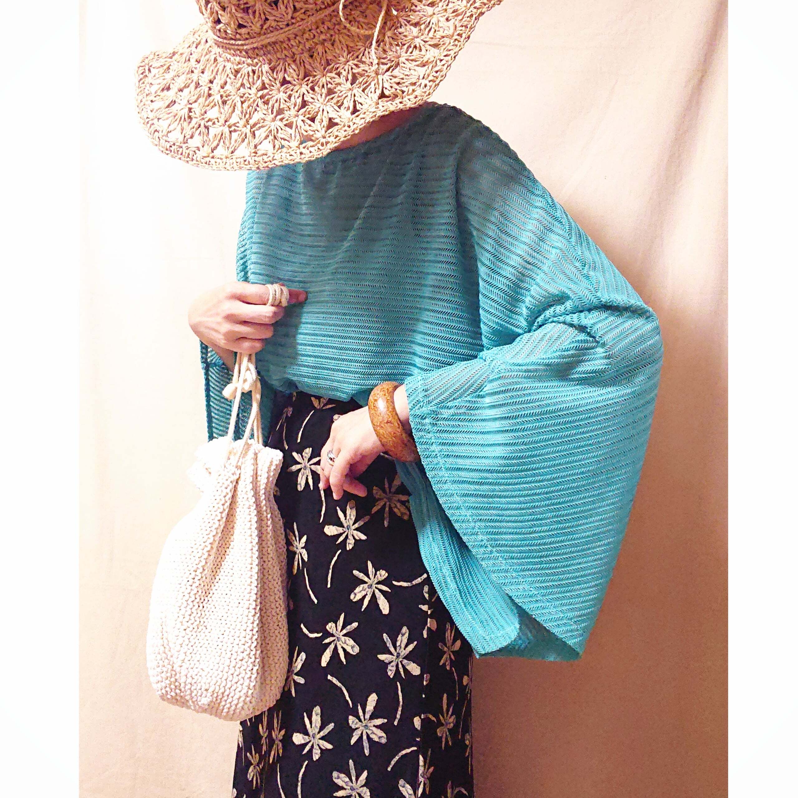 薄手のサマーニットで、綺麗なターコイズブルーカラーが夏らしく、実際はもっと素敵な色合いです。