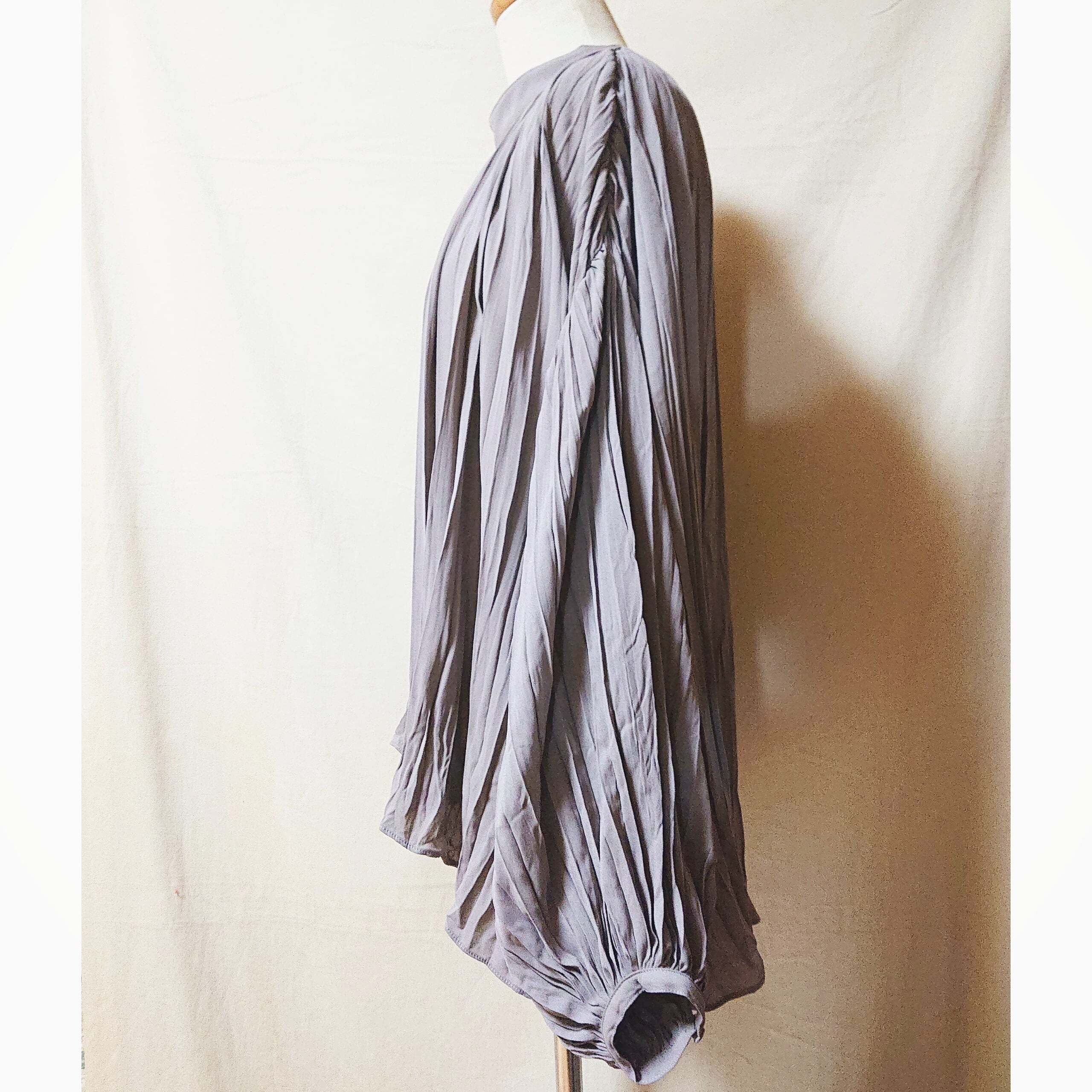 詰め襟タイプのデザインと、動きの出るプリーツデザイン、プラス存在感のあるボリュームスリーブのバランスが、すごくおしゃれで主役級に素敵な一着です。