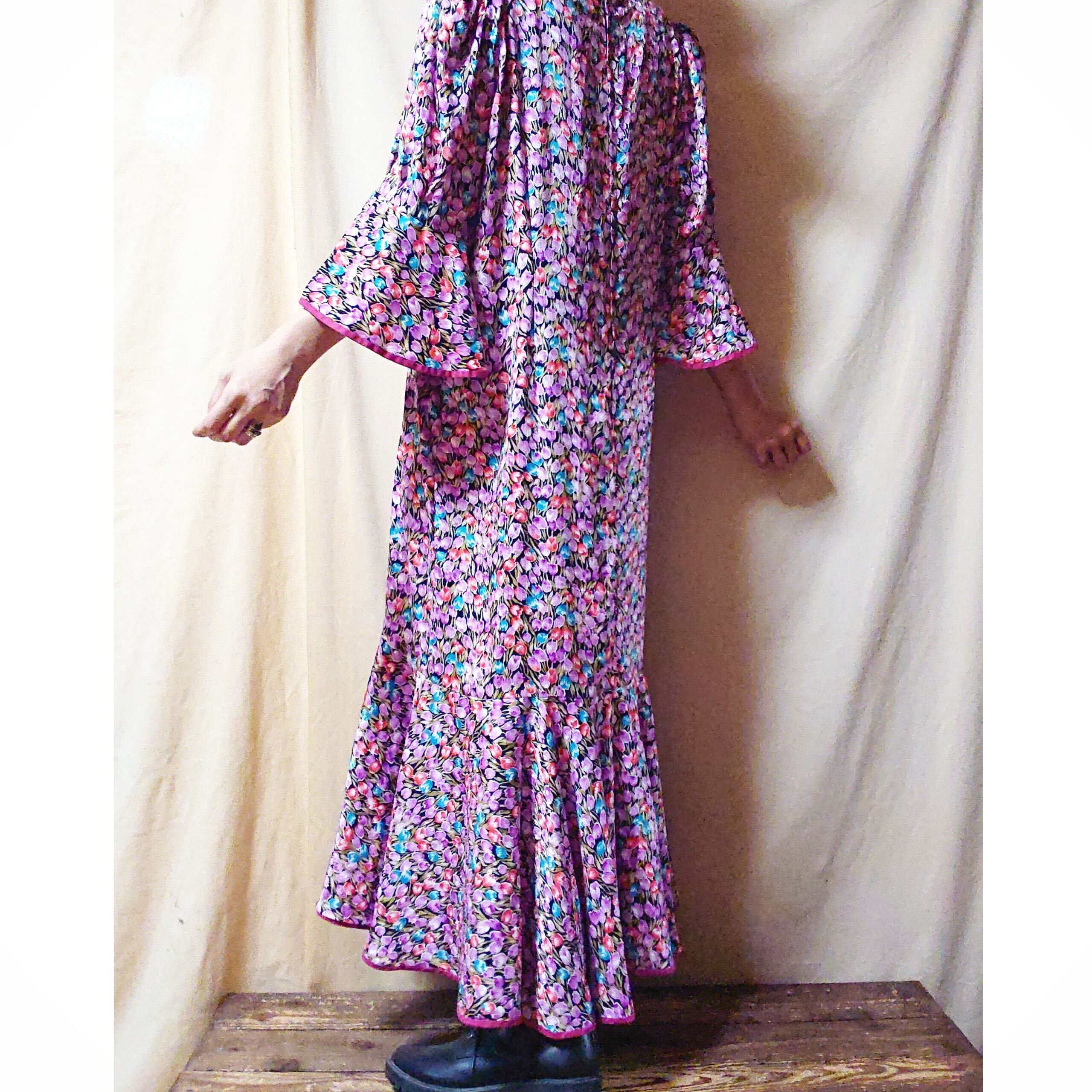鮮やかな花柄と、ティアードタイプのデザインがたまらなく素敵な、ヴィンテージのワンピースです。