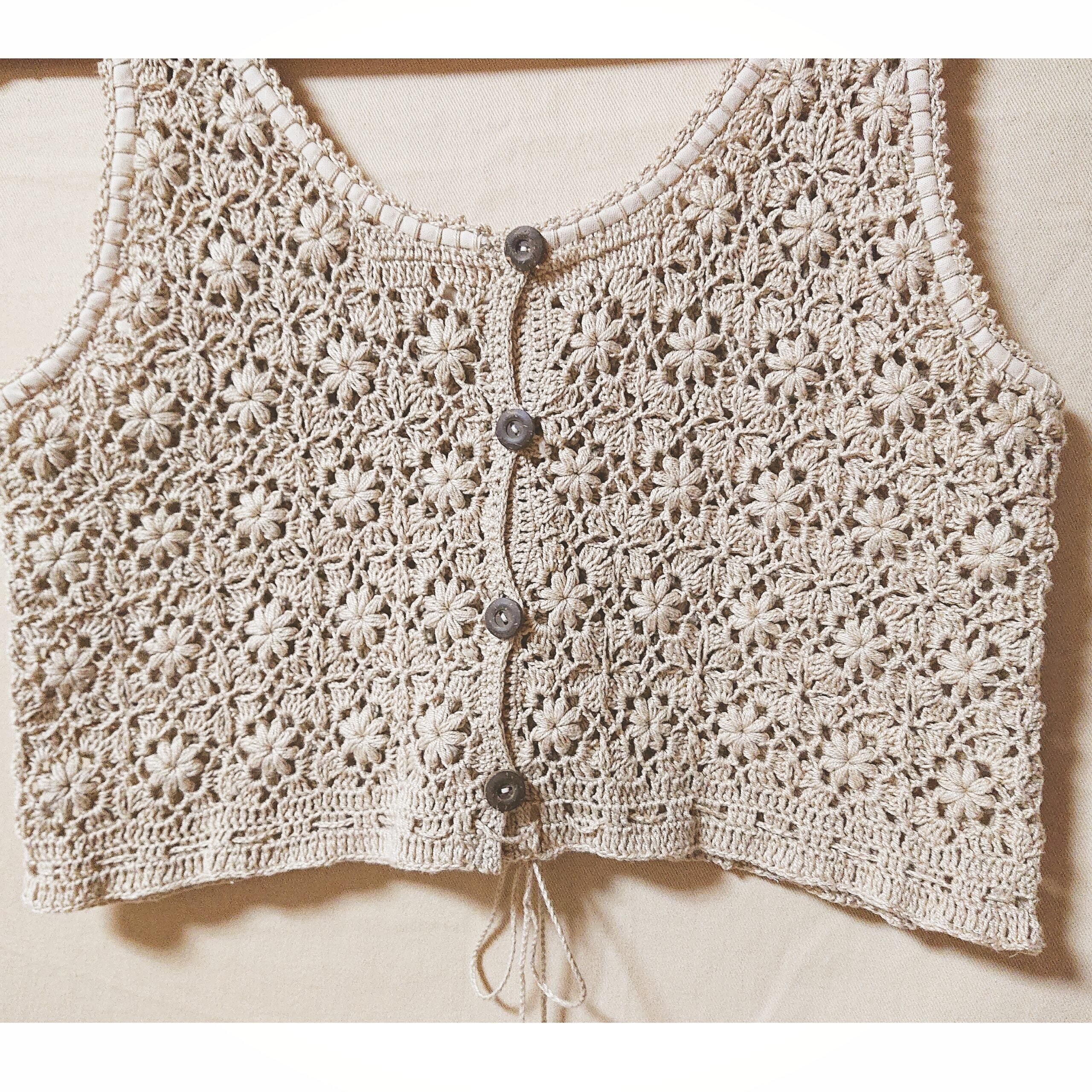 コットンニットで編まれたクロシェ編みが、とても素敵なヴィンテージのベストです。