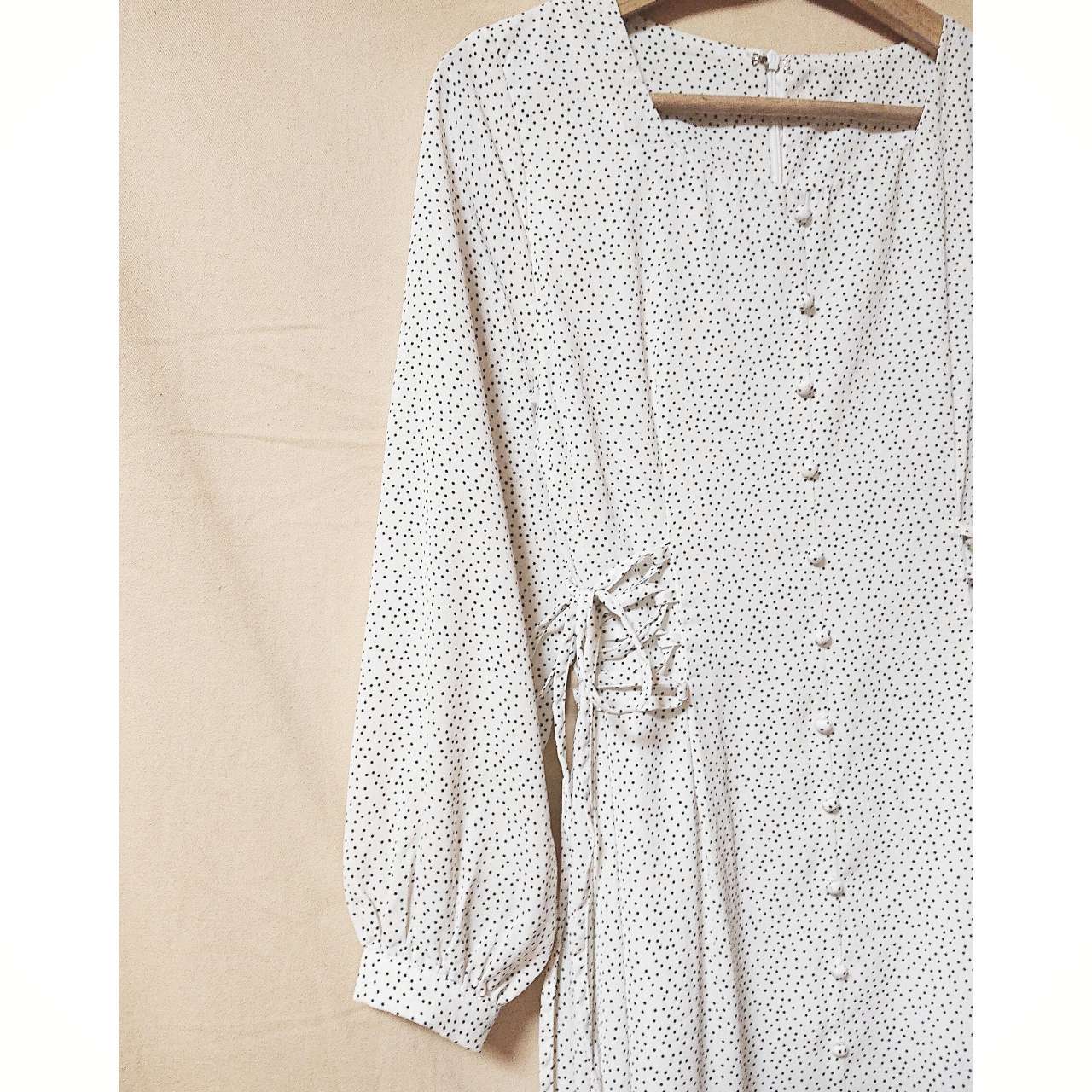 細かいドット柄と、サイドのレースアップデザインがたまらなく素敵な、ヴィンテージのワンピースです。
