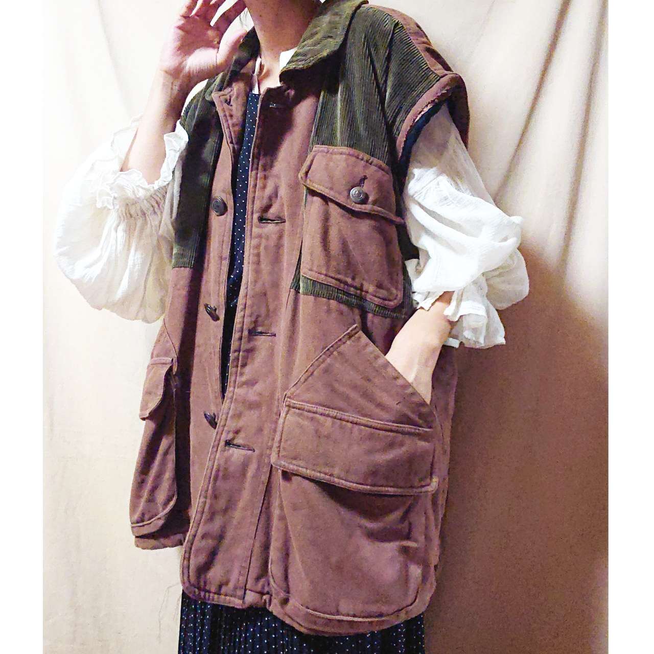 ヴィンテージのハンティングジャケットを、ベストにリメイクした、おしゃれ感たっぷりな一着です。