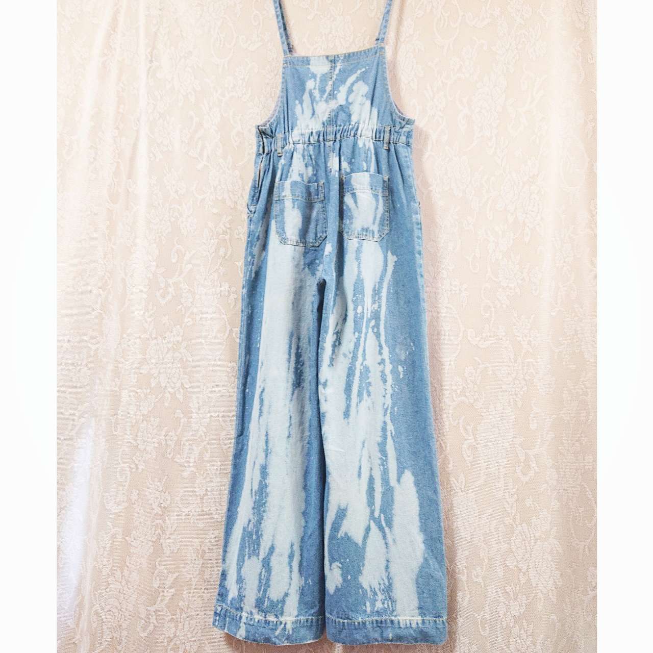 ヴィンテージのデニムサロペットを、大胆にブリーチデザインにリメイクした、おしゃれ感たっぷりな一着です。