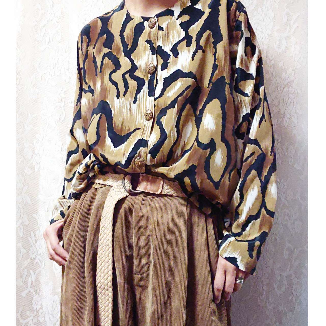 ノーカラータイプのデザインと、個性的なレオパード柄が、とても素敵なヴィンテージのシャツです。