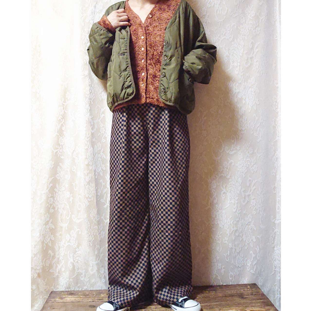 足元をヒールやブーツに返ると、大人っぽい雰囲気にもなり、かなり使える一着です。