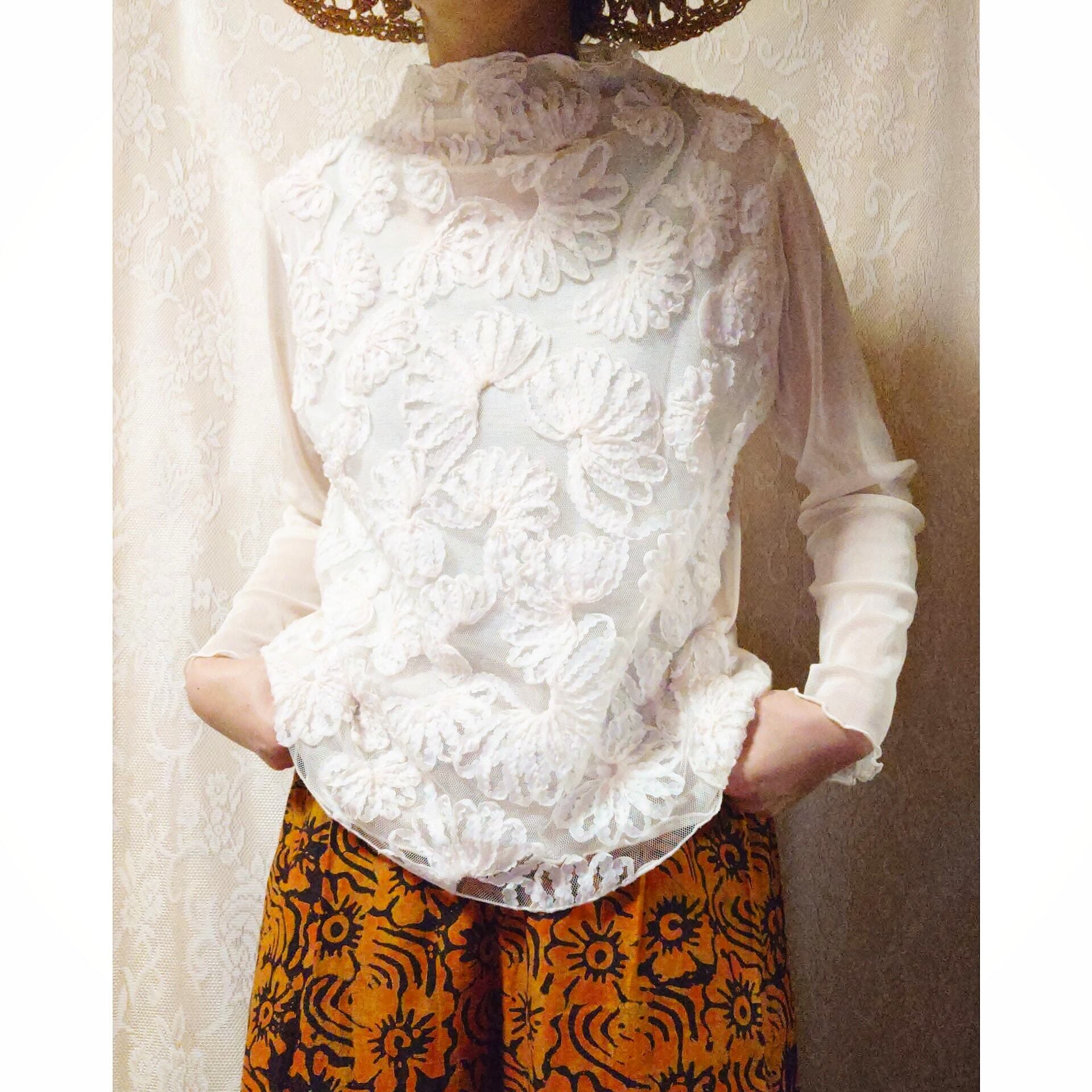 フラワーモチーフデザインと、シアー感がたまらなく素敵なヴィンテージのトップスです。