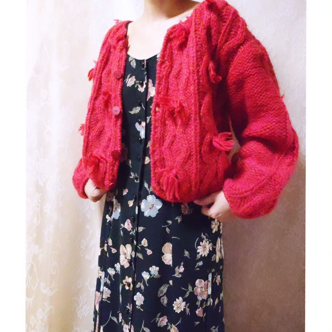 タッセルがついたデザインがたまらなく可愛い、ヴィンテージのニットカーディガンです。