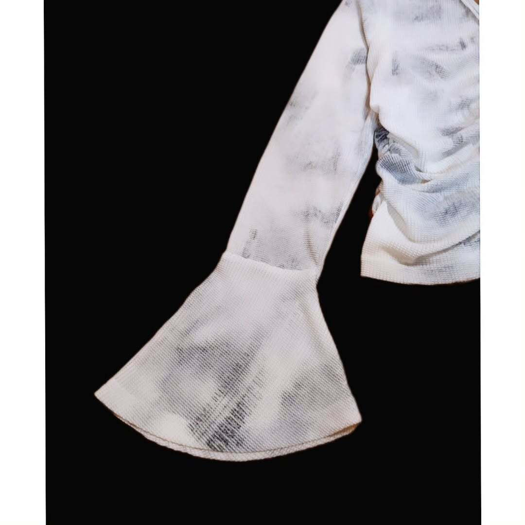 タイダイ染めのような風合いのテキスタイルも素敵で、存在感のあるベルスリーブが更におしゃれ感を際立たせています。